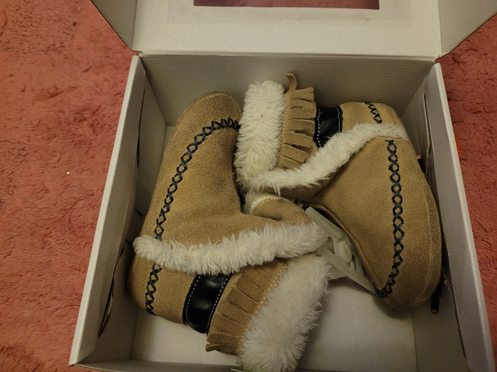 New with tags. SoftMoc brand baby slippers. Tan suede-like material. Faux fur trim. Size 6-12 months. Perfect for keeping little toes warm.