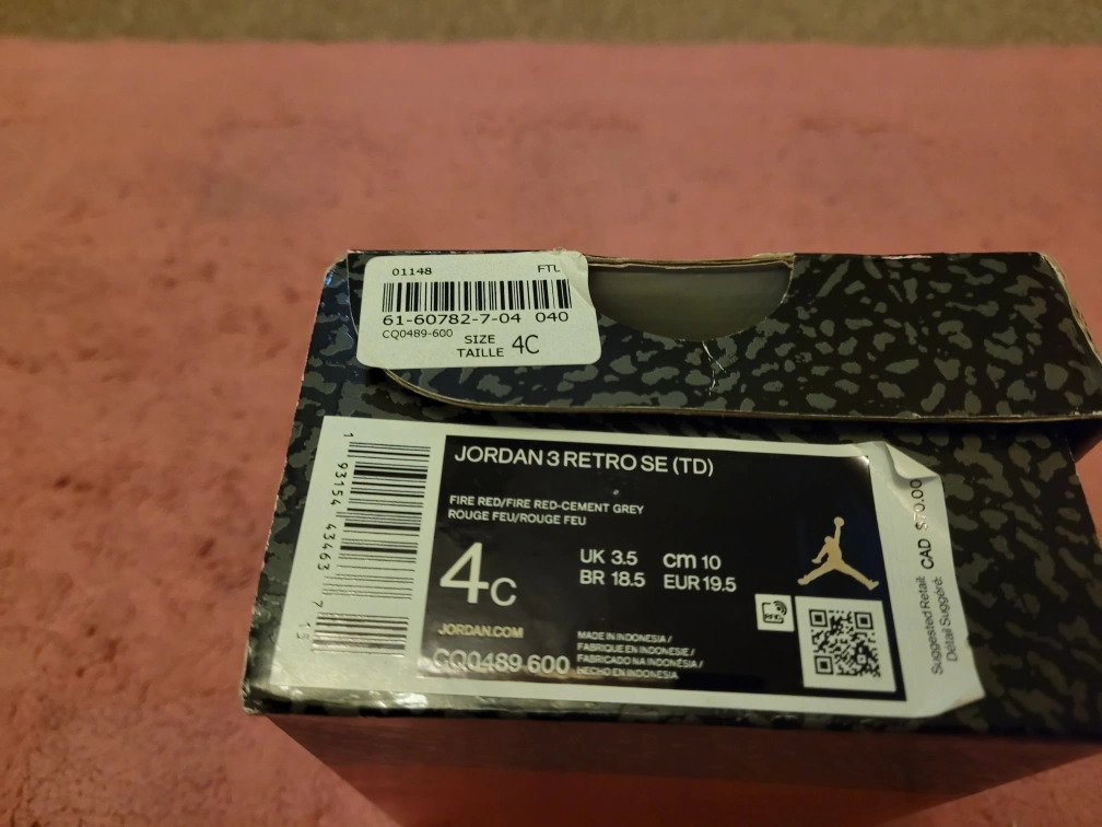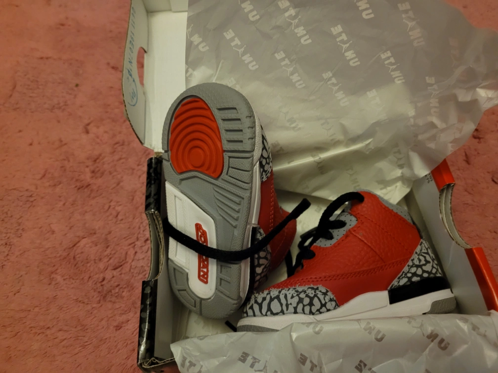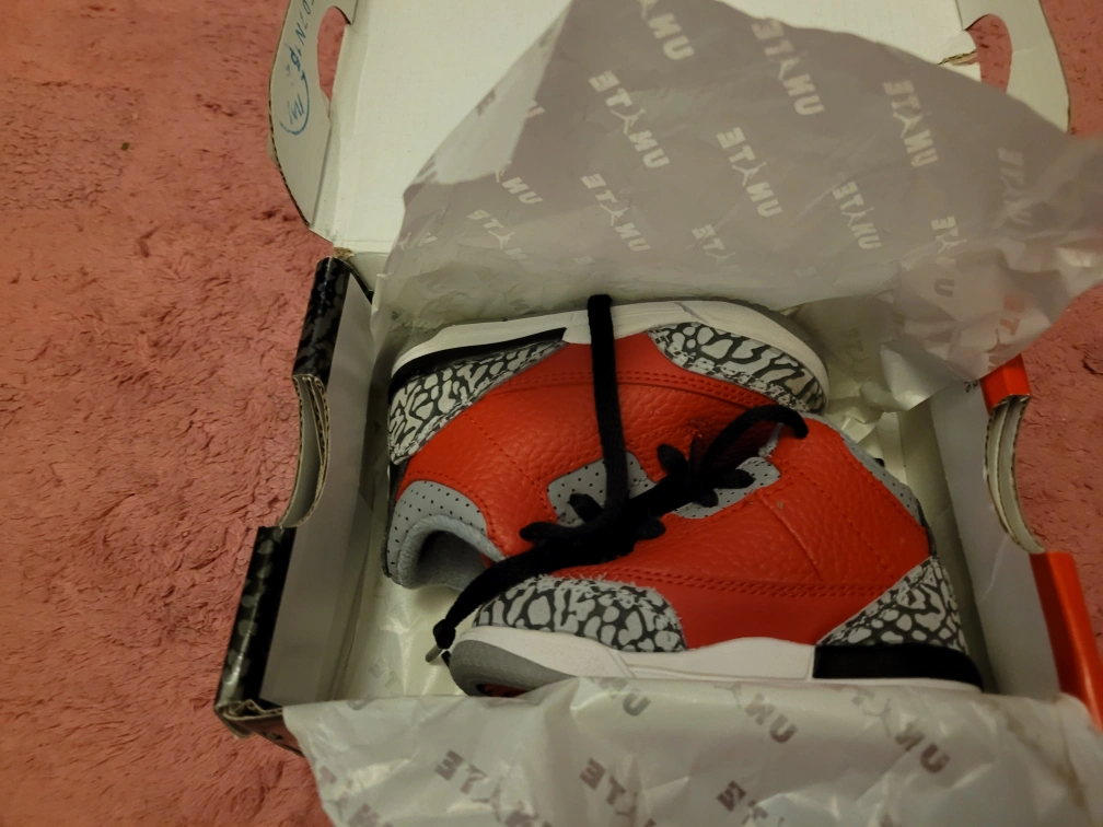 Infant Jordan 3 Retro sneakers. Size 4C. Fire Red/Cement Grey colourway. New in box.