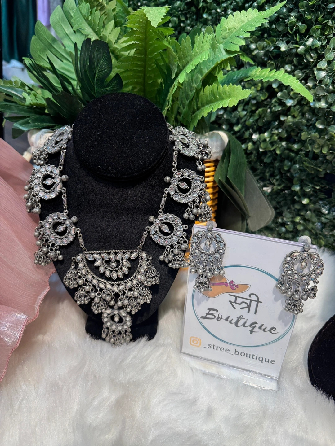 Stunning oxidized silver necklace set. Features intricate detailing and sparkling accents. Includes a matching pair of earrings. Beautiful statement piece.