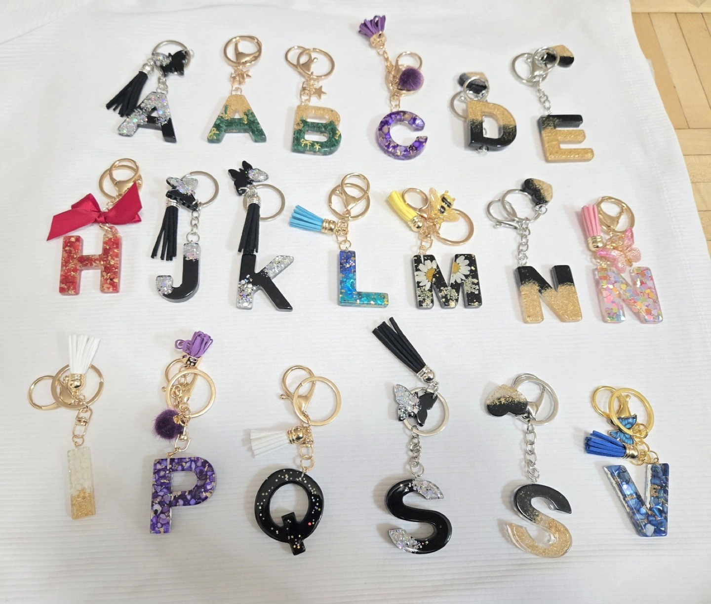 Handmade resin keychains. Each features a letter of the alphabet. Various colours and embellishments. Great gift idea! Each :5$