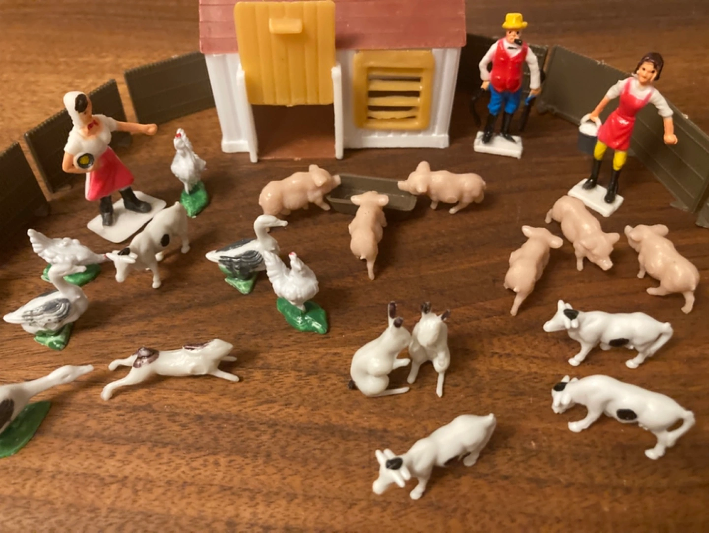 Cute vintage farm playset. Includes barn, farmer and farmhand figurines, pigs, geese, cows, and rabbits. Green plastic fencing surrounds the scene. Great for collectors or imaginative play. Or decorate a farm themed cake! Pencil for scale.