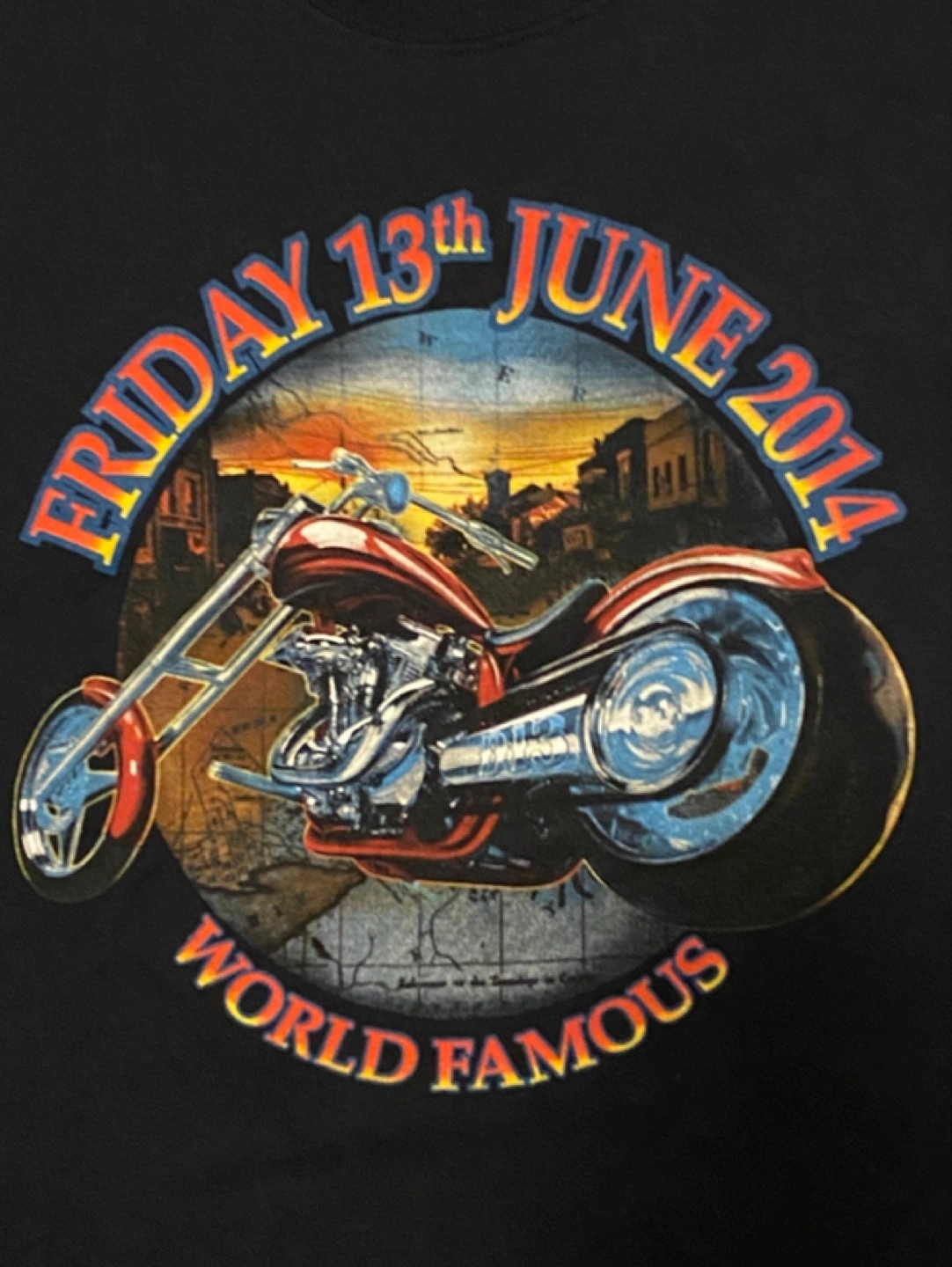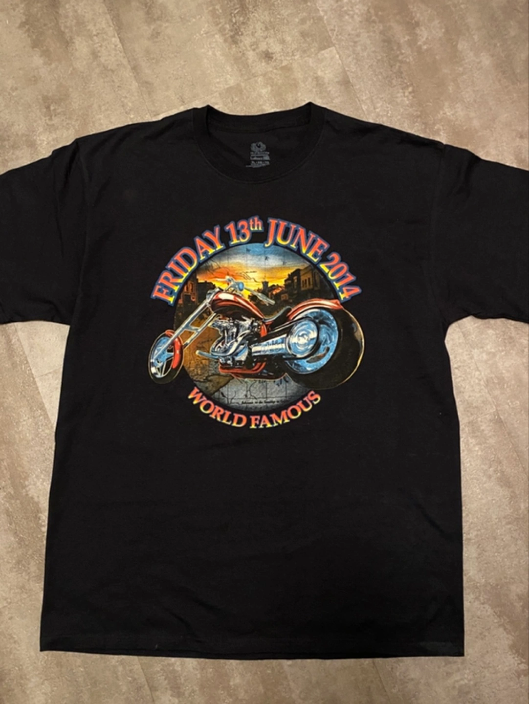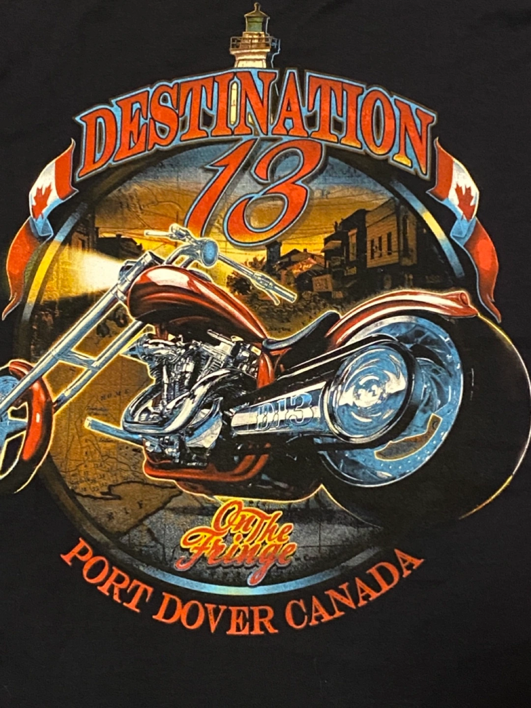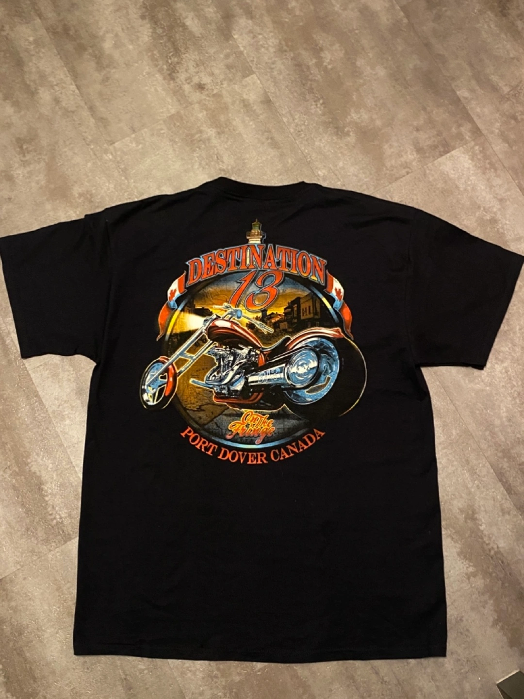 Black t-shirt. Features a graphic of a chopper motorcycle. Front design says "Friday 13th June 2014 World Famous." Back design says "Destination 13 On the Fringe Port Dover Canada." Never worn, just collected! Excellent Condition! Cash and pick up only, Cawthra and Lakeshore area in Mississauga. Size men’s XL