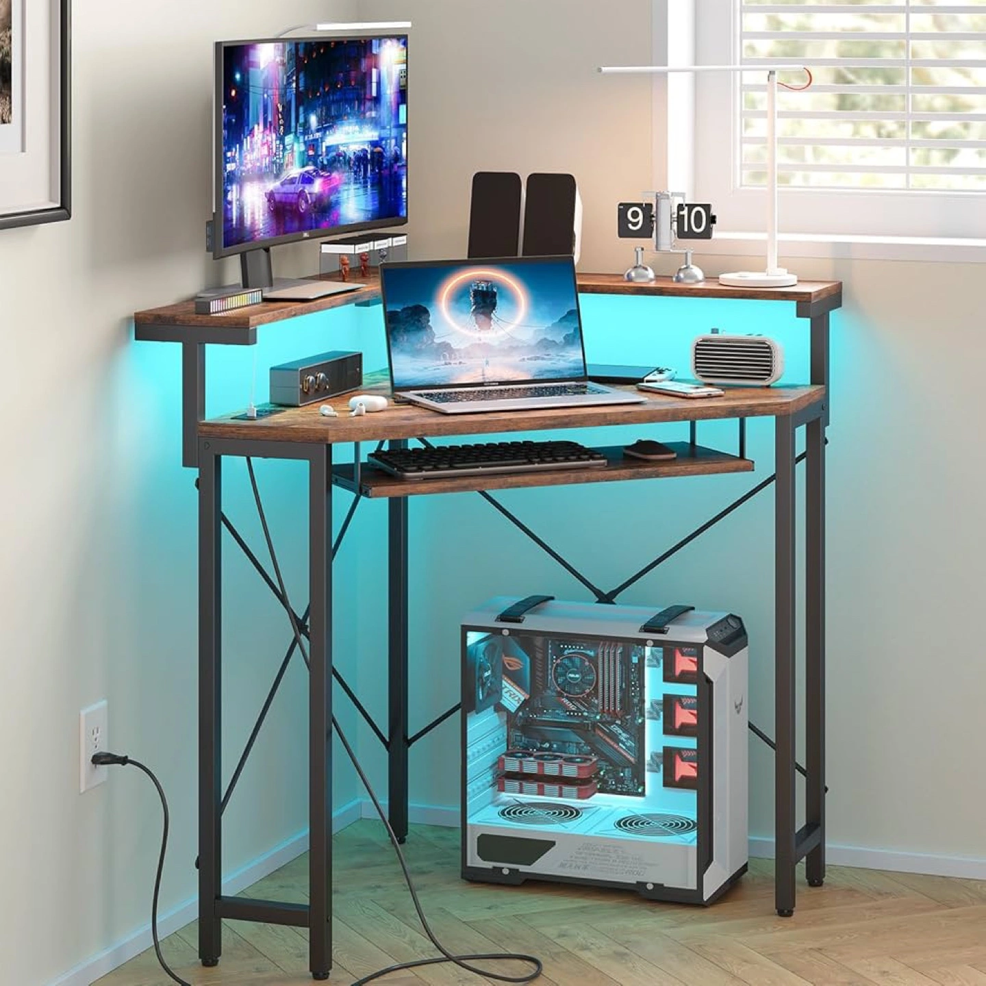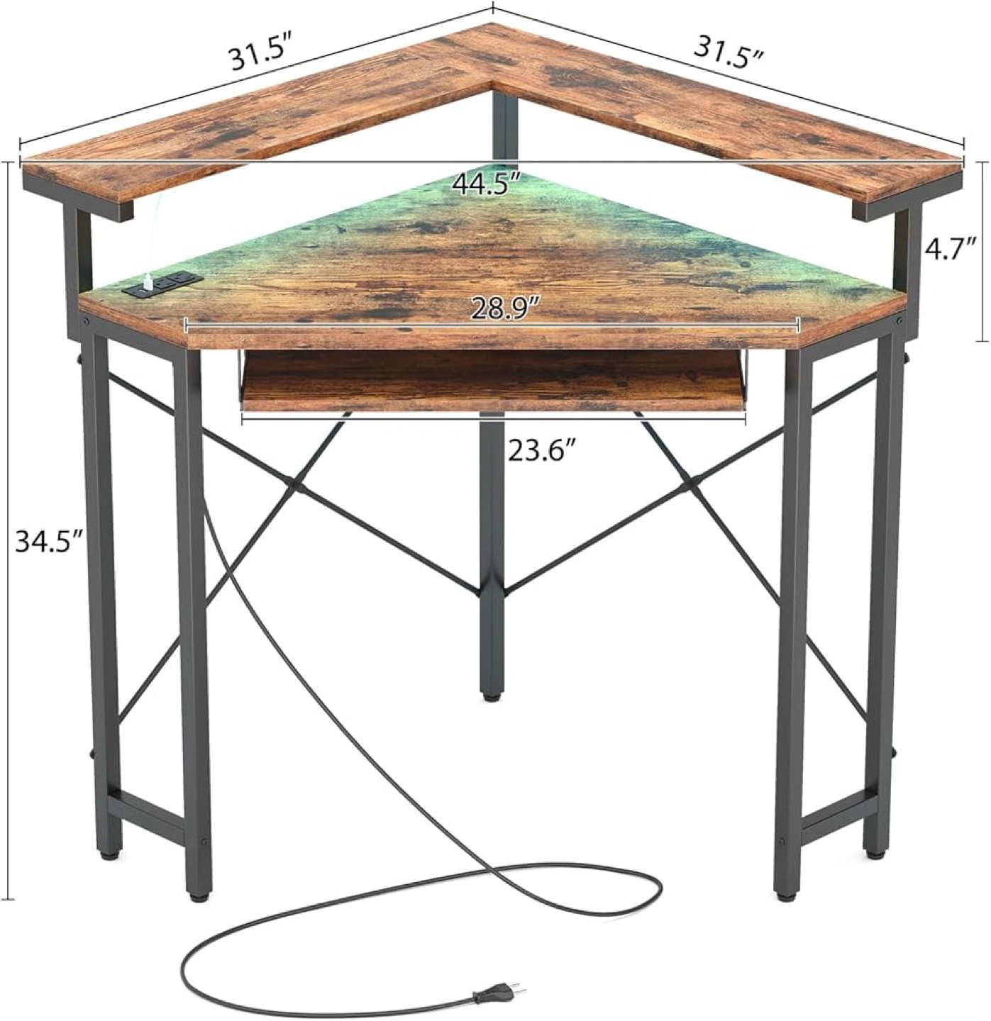 Brand New in Box, Corner Computer Desk from Monshey. All Parts Included. Features a Sliding Keyboard Drawer, and Power adapter with usb ports and plugs. This product is in its original box and is brand new / unused. *Assembly Required* Brand monshey Shape Triangular Product Dimensions 80D x 113W x 87.6H Colour Brown Safety Power Corner computer desk features a 2AC eensuring your phone, iPad, and laptop are charged effortlessly. Monitor Stand & Keyboard Tray: Equipped with a full-size monitor stand and keyboard tray, this computer desk accommodates dual monitors. It ensures parallel sightlines and monitor alignment for optimal spinal health while seated. Versatile Usage: The triangular writing workstation is a perfect fit for small corners in various rooms such as living rooms, bedrooms, and studies. Compared to other desks, our corner table takes up less space, providing you with a practical area. Moreover, it can also double as a dressing table in your makeup room or bedroom according to your preferences. Sturdy & Durable: Crafted from premium particle board, our corner desk guarantees robustness and durability. The metal frame structure ensures stability and prevents shaking or vibrations during use. With a desktop load-bearing capacity of up to 132 LB, it easily accommodates diverse daily load demands. Effortless Assembly & Easy Maintenance: Our detailed manual makes the assembly process simple and hassle-free. Furthermore, maintaining the complete corner table is a breeze. A soft cloth is all you need for quick and easy cleaning in your daily routine.
