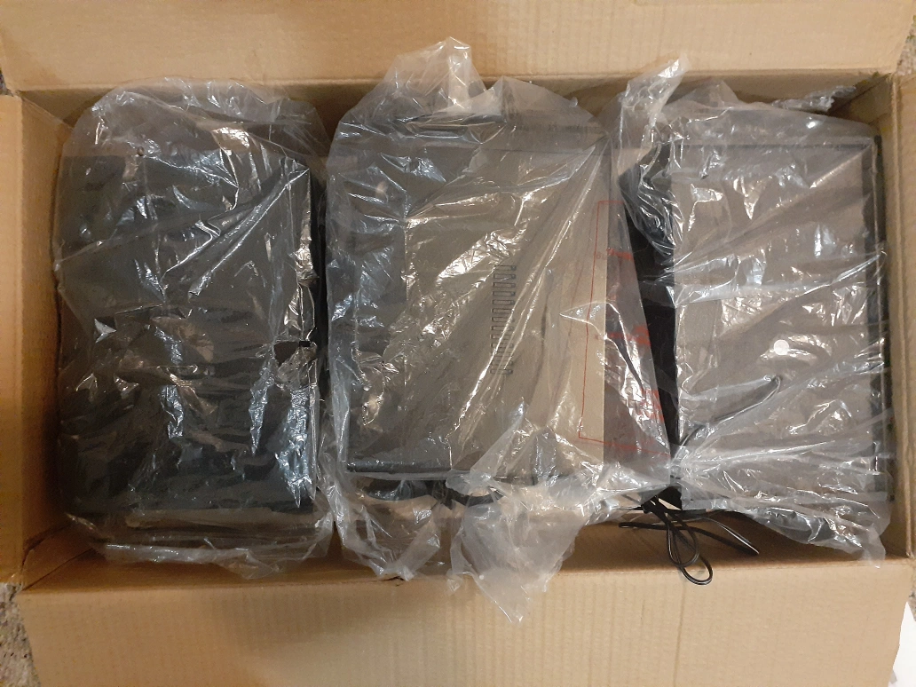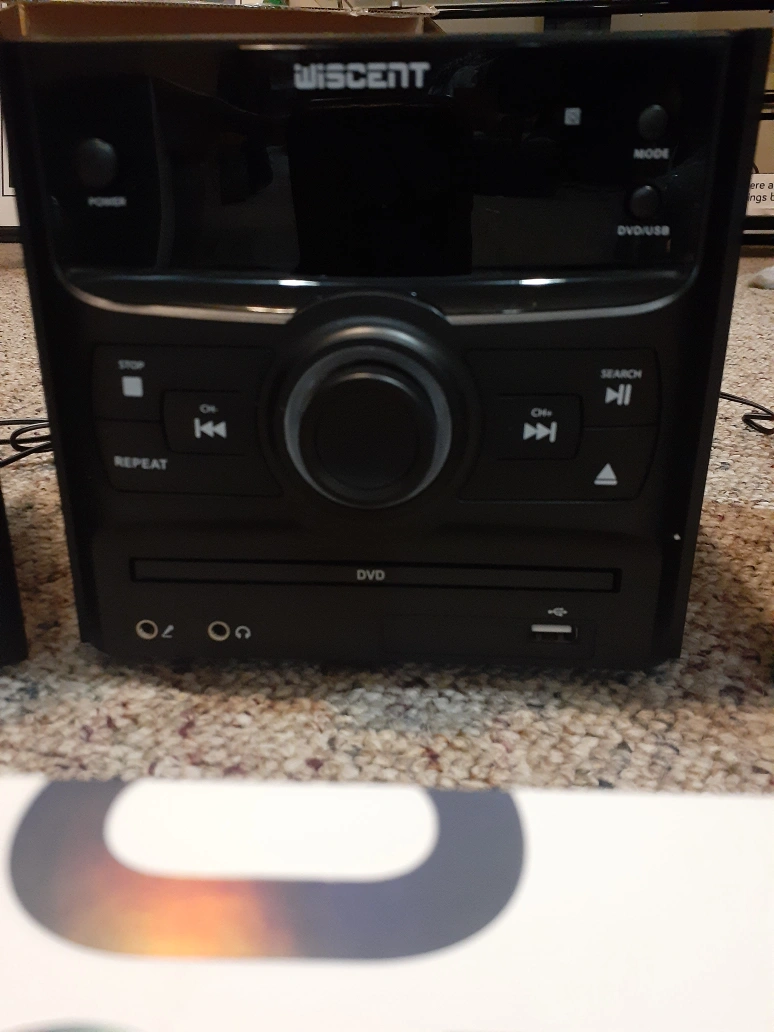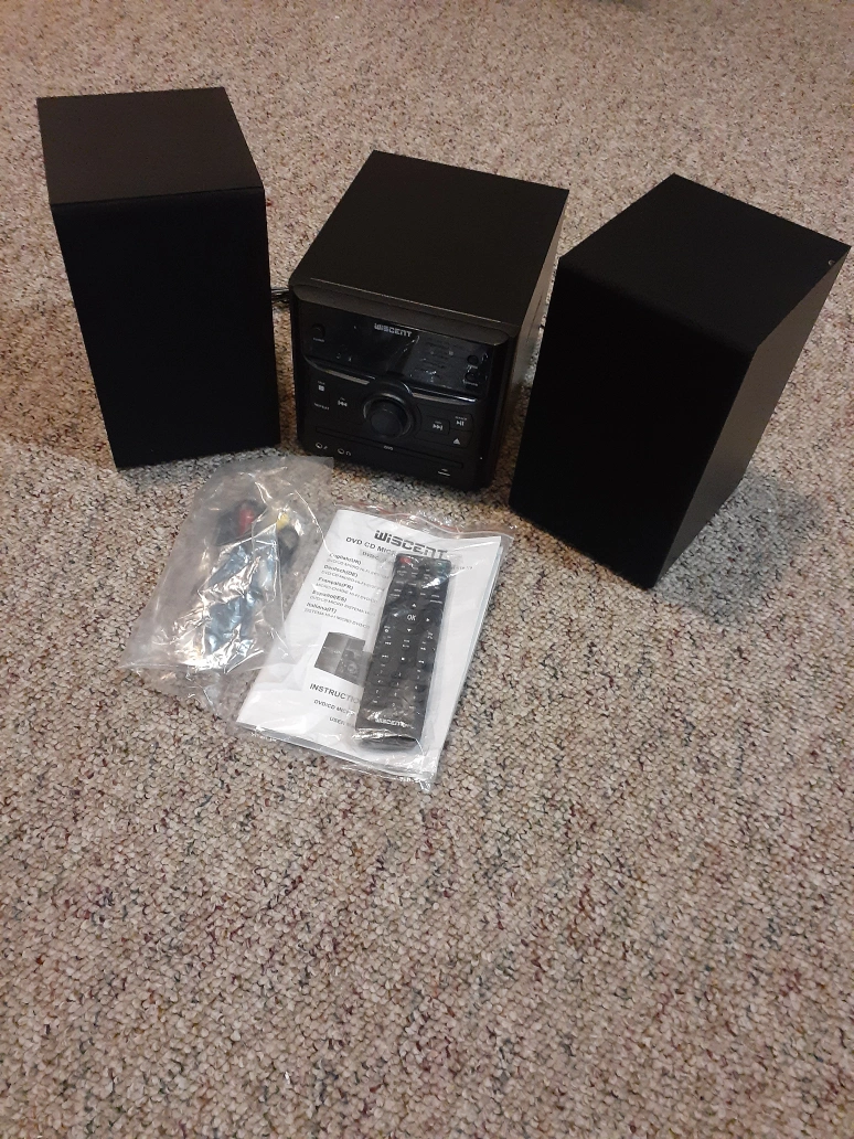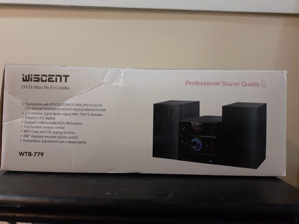 Black DVD mini Hi-Fi system. Includes two speakers and remote. Plays CDs, DVDs, and USB. Features LED display and karaoke function. Professional sound quality.