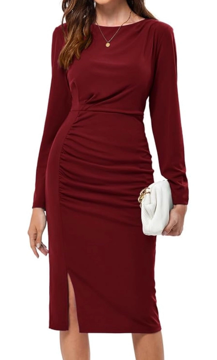 Elegant black midi dress. Features long sleeves, a round neckline, and a flattering side slit. Bodycon fit. Perfect for a special occasion.