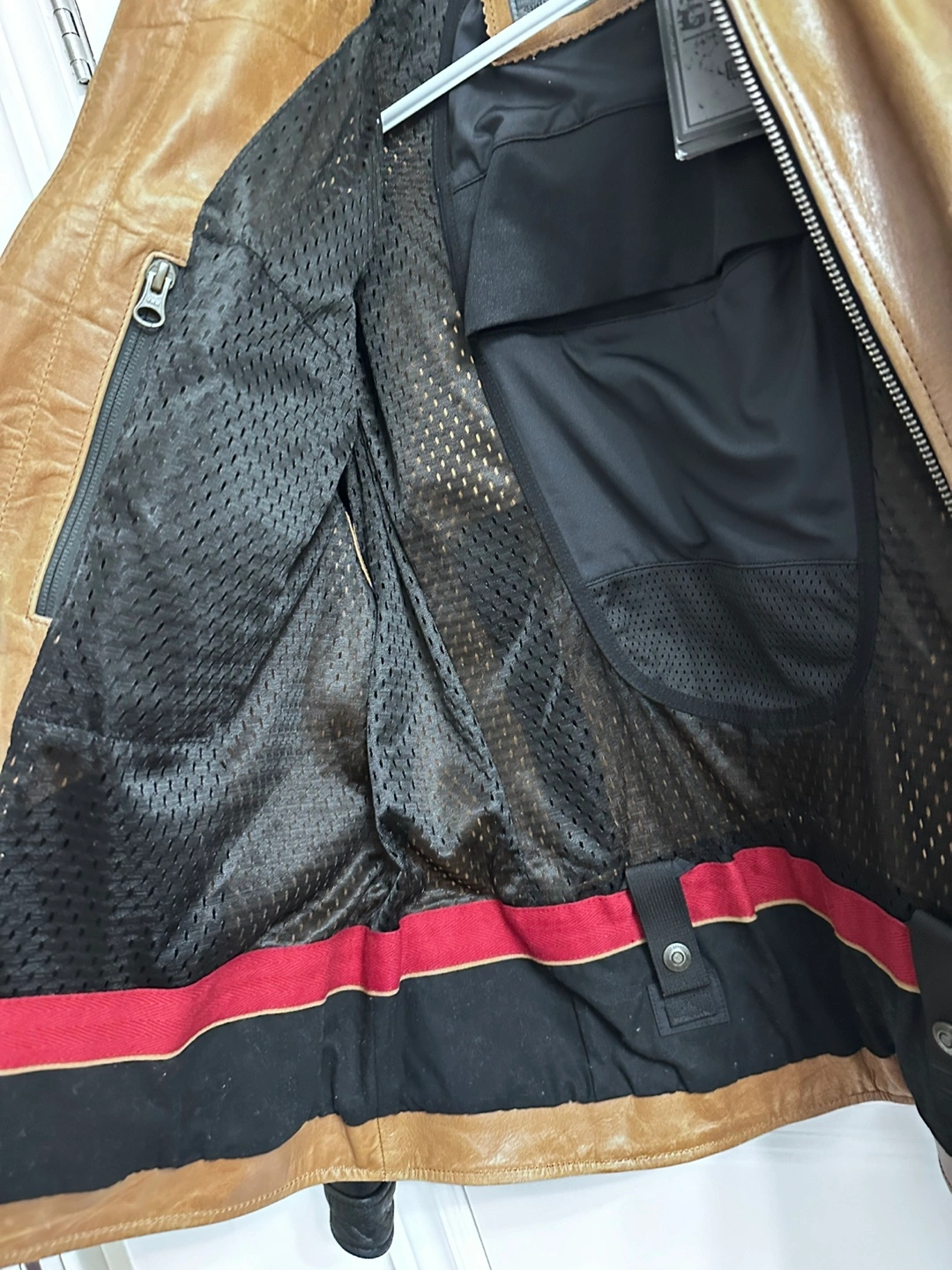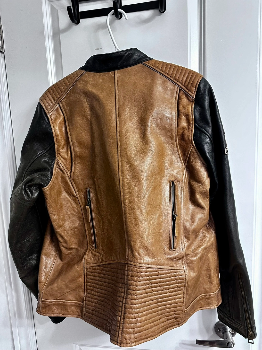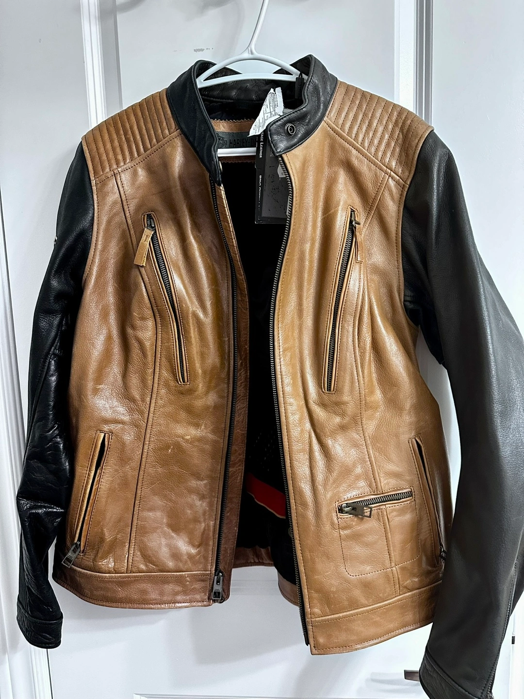 Two-tone brown and black leather motorcycle jacket. Features a mesh lining and multiple pockets. Includes original tags. X-Large. Beautiful riding jacket.
