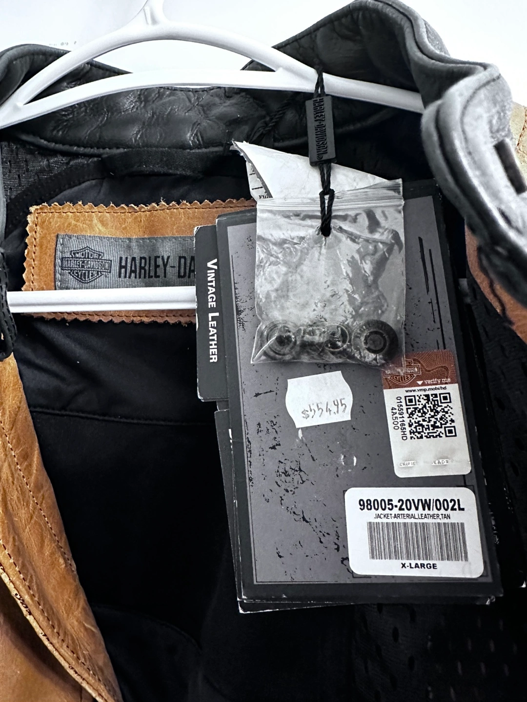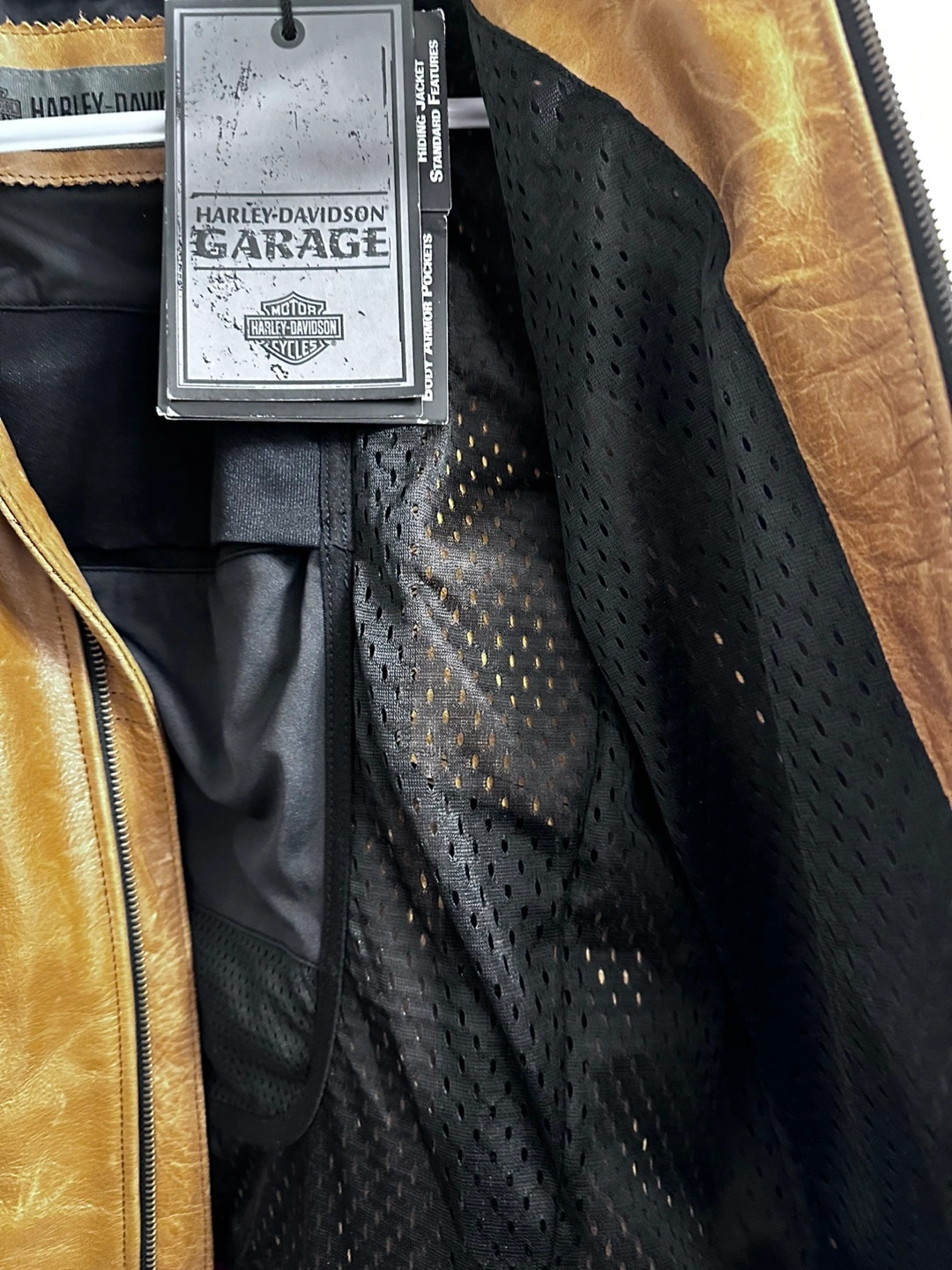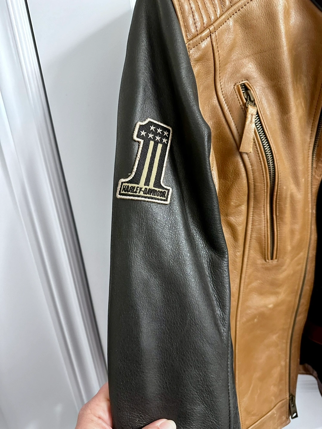 Two-tone brown and black leather motorcycle jacket. Features a mesh lining and multiple pockets. Includes original tags. X-Large. Beautiful riding jacket.