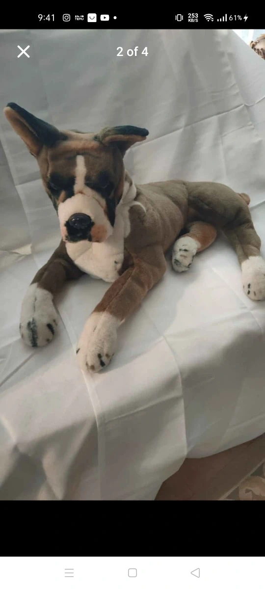 Adorable plush boxer dog. Brown and white markings. Large size. Soft and cuddly. Made in China.