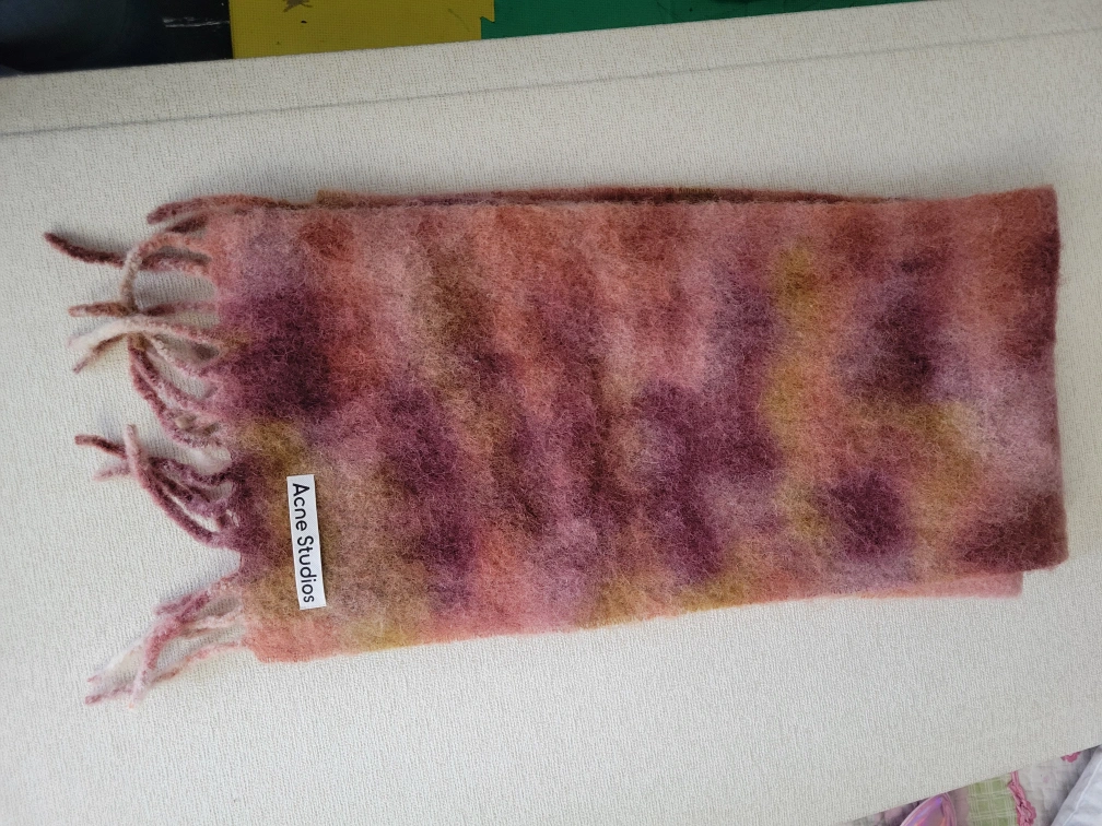 Beautiful Acne Studios wool scarf. Features a unique tie-dye pattern in shades of pink, brown and orange. Soft and warm, perfect for fall and winter. Fringe detailing.