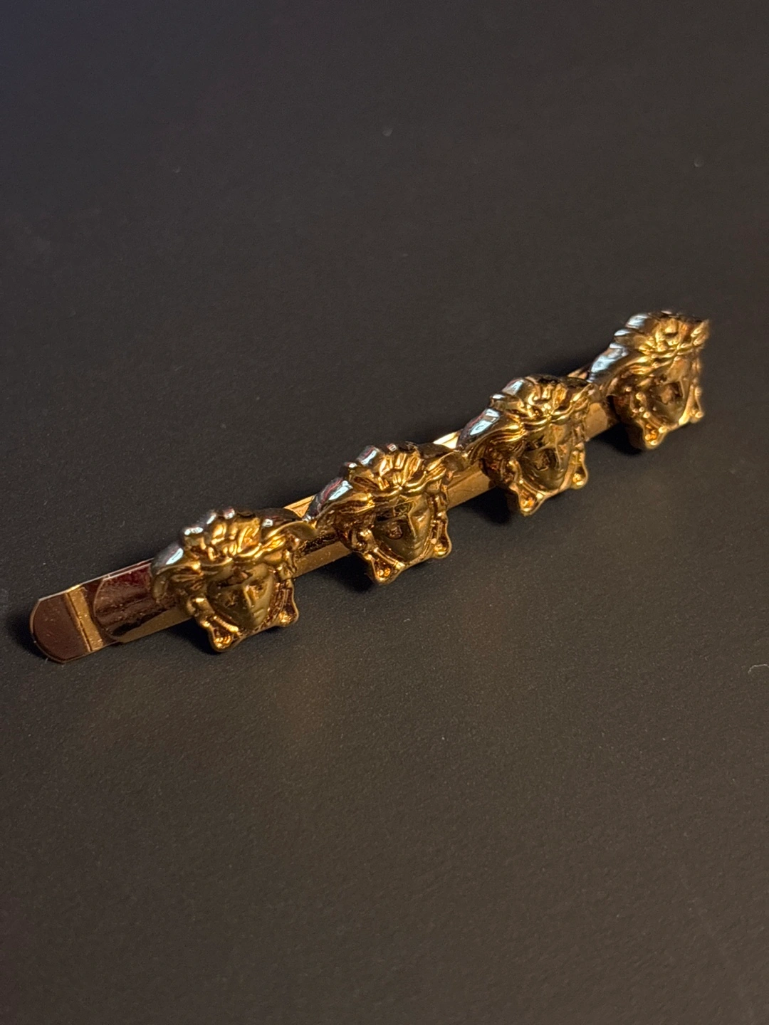 Gold-tone metal hair barrette. Features four Medusa heads. Elegant and stylish. Pre-owned.