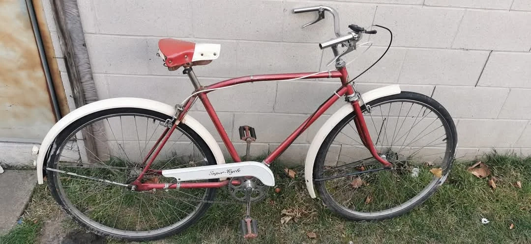 Red and white vintage bicycle. Features fenders and a chain guard. Shows some wear.