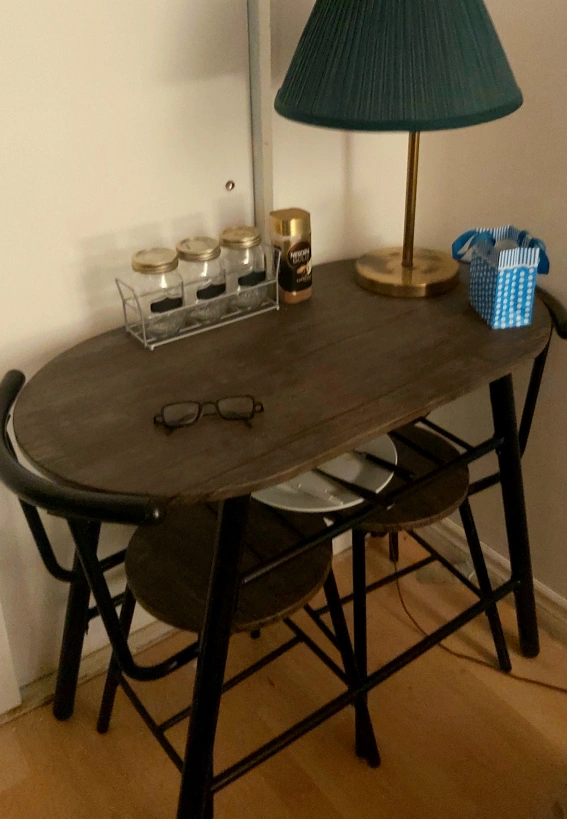 Durable material which cannot be stained nor damaged during the move as it is made of strong sturdy wood counter top and black metal frame. Also, has space for keeping your plates under the table top. The set of chairs, share the same material of hardwood & black metal frame matching with the table. Perfect for saving space as this is a compact set with chairs that slide right under the table giving a neat and clean look to your area. Small table with oval top and two matching chairs. 🧡 In Excellent Condition 🧡