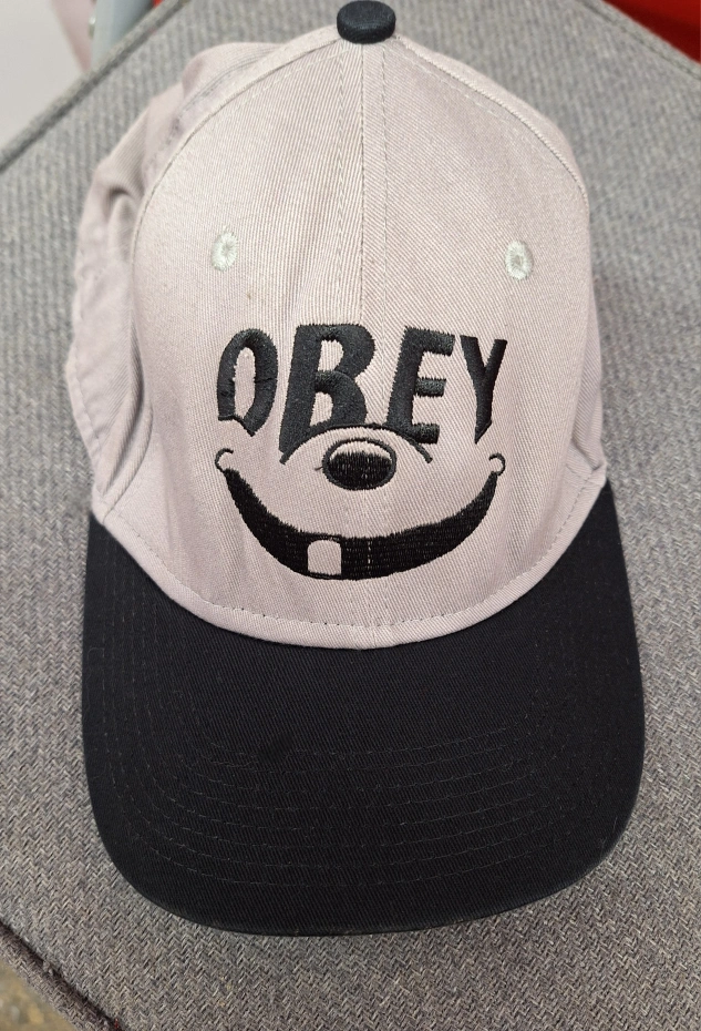 Grey and black baseball cap. Features Obey logo and cartoon animal snout. Adjustable. Proceeds to cat rescue, Kit Cat Club Of Hamilton Upper Wentworth and Queensdale area Hamilton mountain