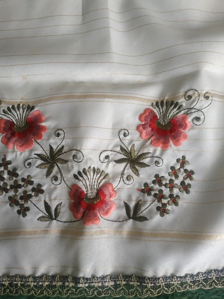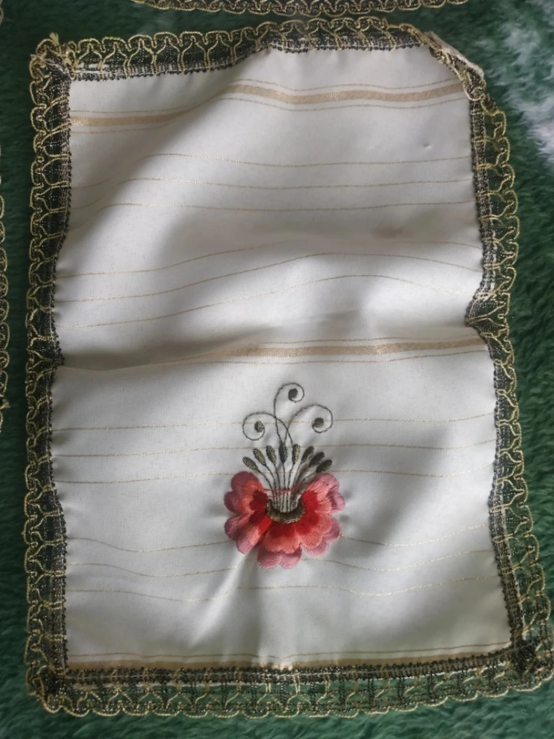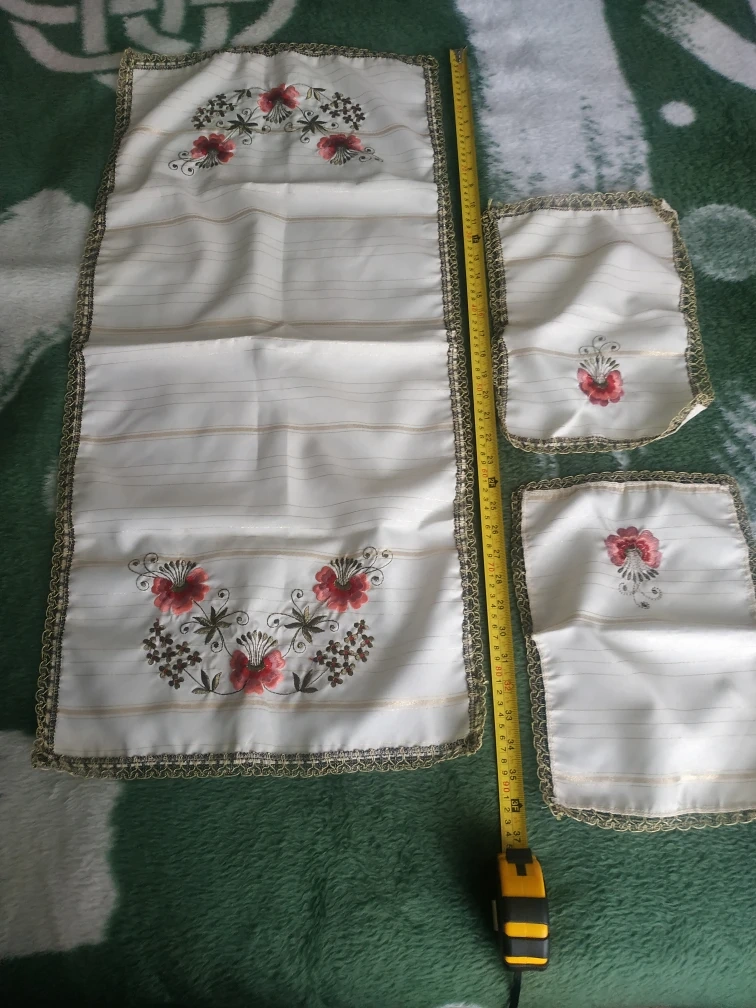 Beautiful embroidered mat set. Off-white fabric with red and green floral embroidery. Gold-coloured trim. Set includes one large mat 34" by 17" and two smaller mats13" by 8" . Excellent condition but will need to be ironed as it was stored in drawers.