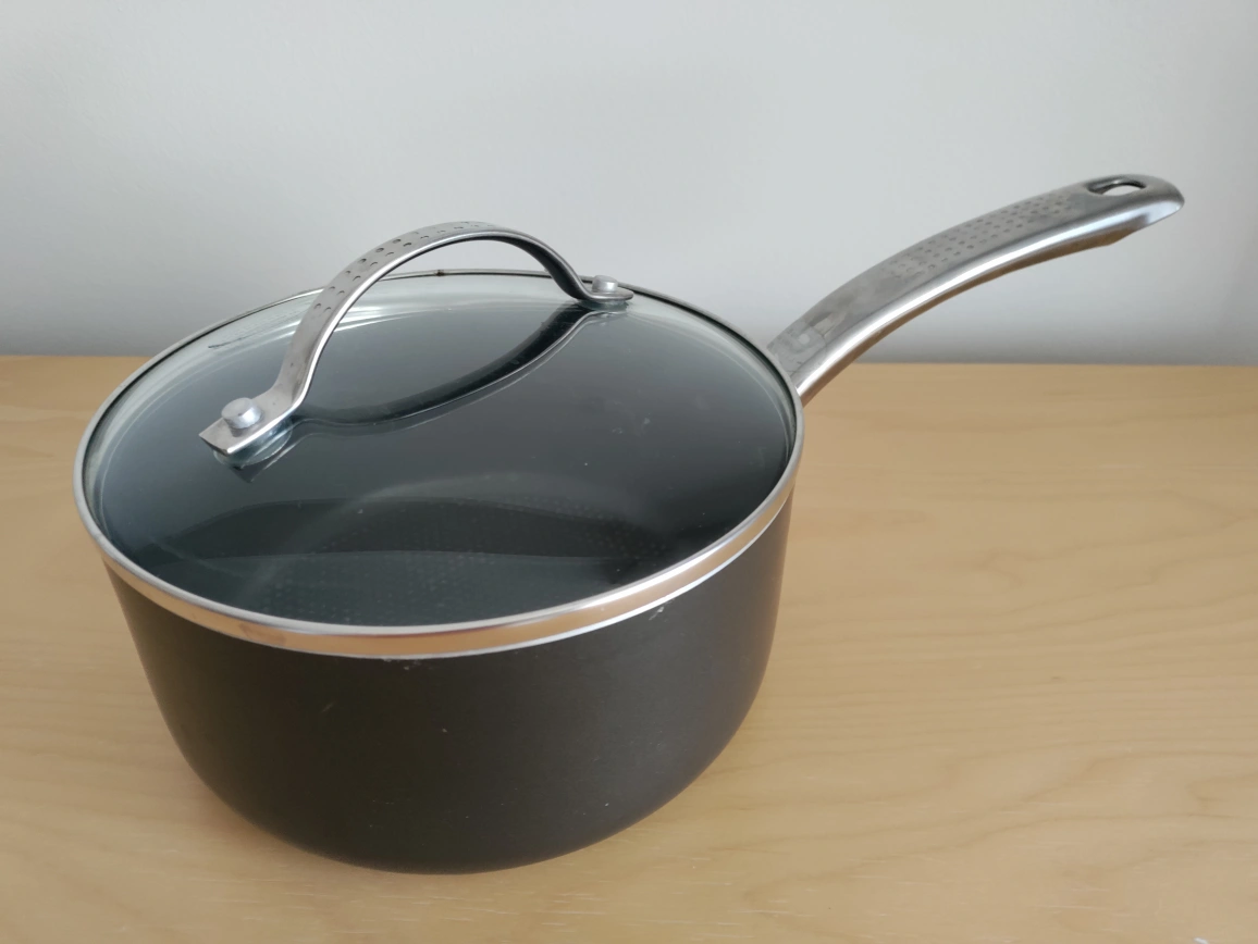 Small saucepan. Glass lid. Stainless steel handle. Excellent for stovetop cooking.