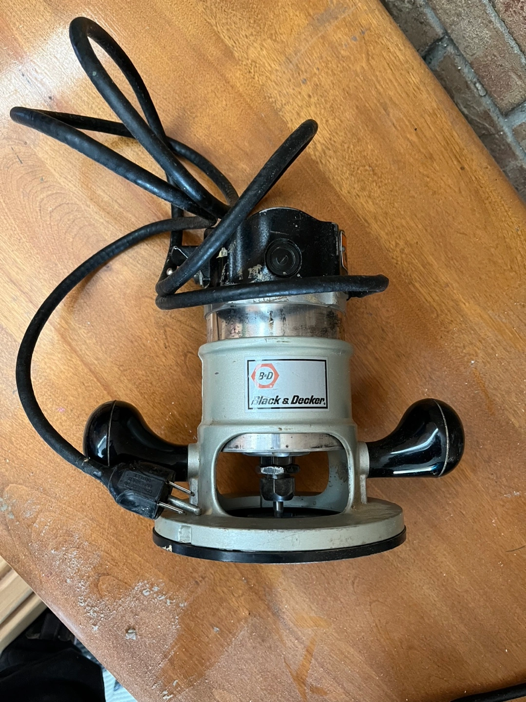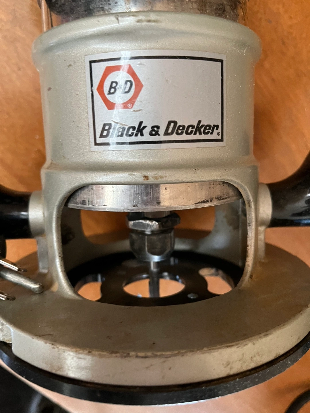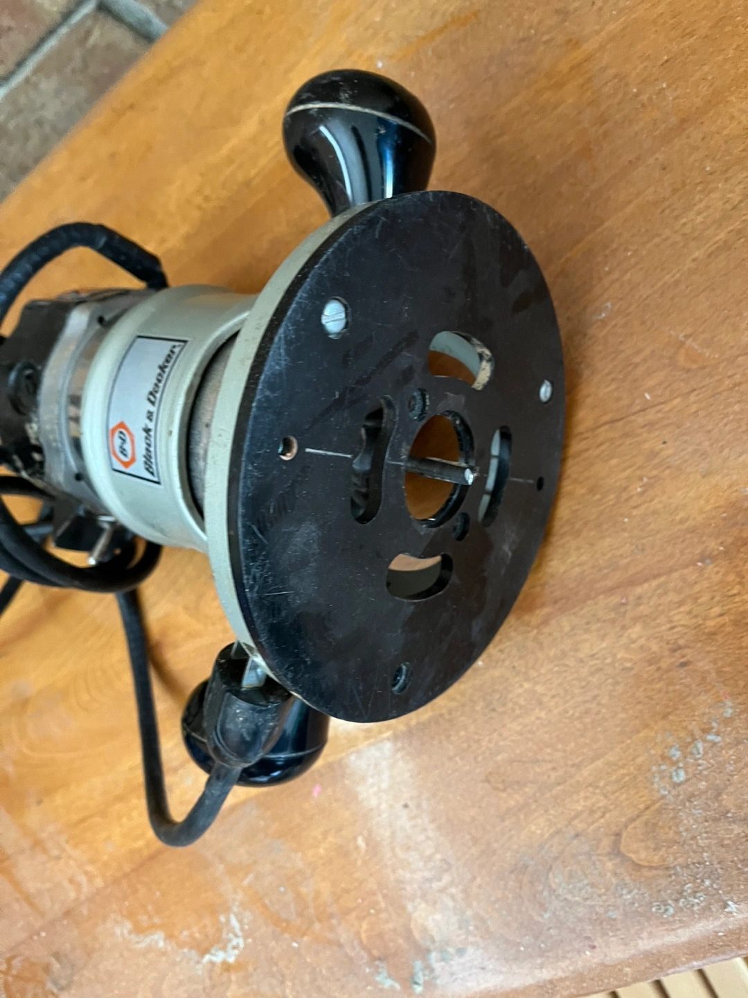 Used Black & Decker router. Includes power cord and base. Shows signs of wear.