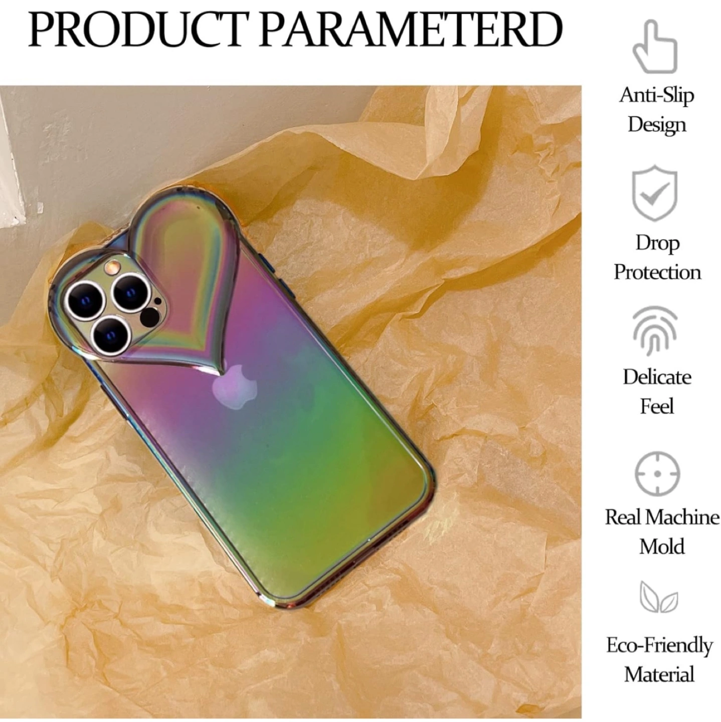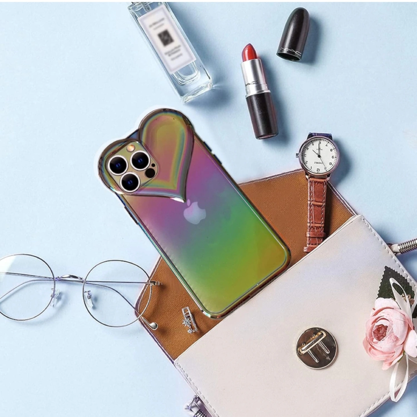 Cute iridescent phone case. Heart shaped design. Compatible with iPhone 13 Pro Max. Offers drop protection and has a delicate feel. Anti-slip design. Only available for pick up.