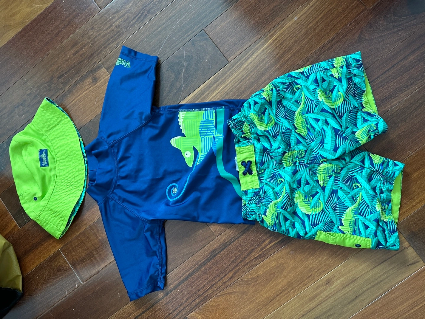 Adorable Ushi Kids swim set. Includes rash guard, swim trunks, and bucket hat. Size 4T. Tropical print. Great for summer fun!