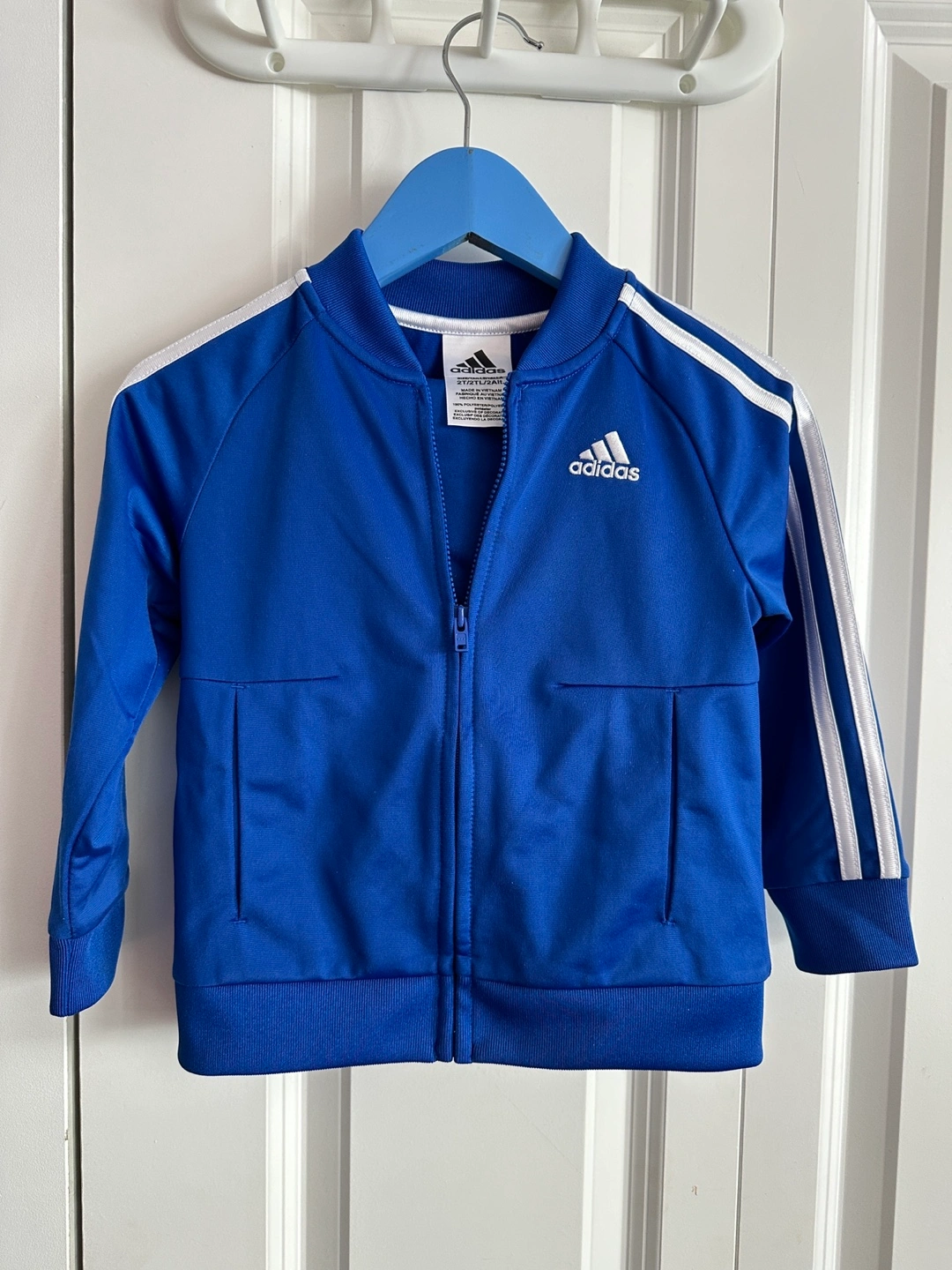 Adorable Adidas tracksuit set . Blue with white stripes. Zip-up front. Great for active play. Size 2T