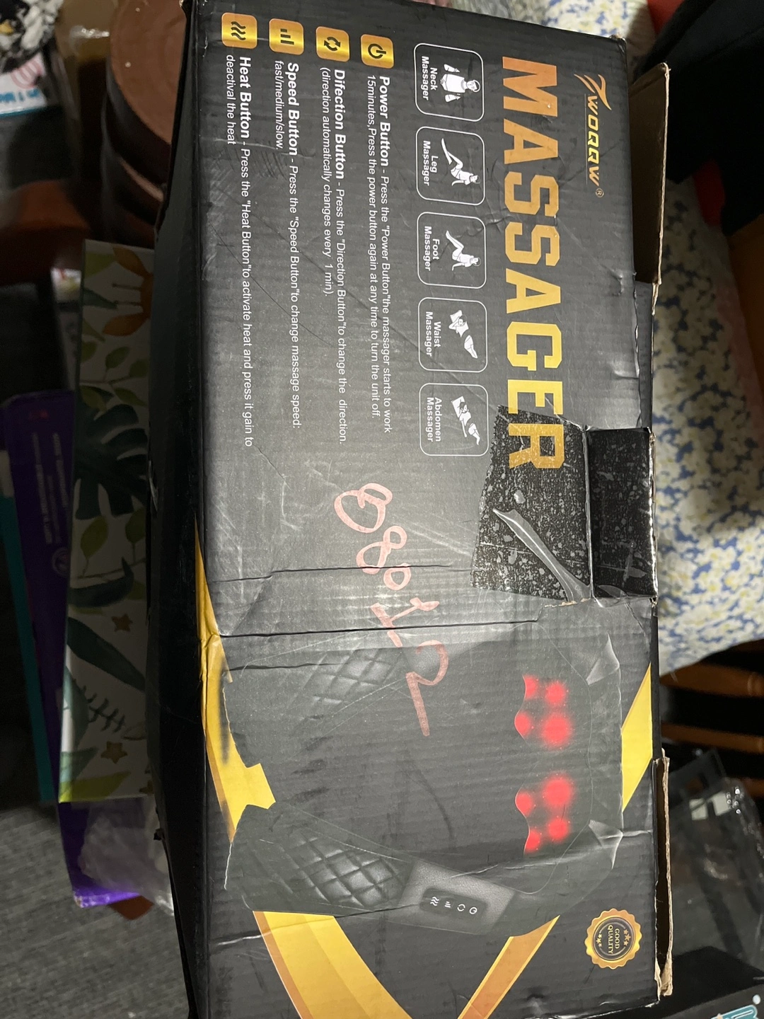 Electric back massager with heat function. Multiple massage speeds and directions. Includes neck, leg, foot, waist, and abdomen massage options.