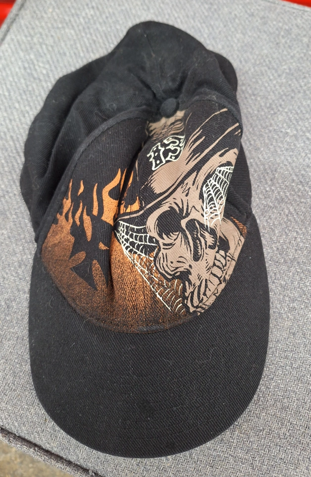 Black baseball cap. Features a graphic design of a skull with flames, spiderwebs, and 13. Adjustable sizing. Proceeds to cat rescue, Kit Cat Club Of Hamilton Upper Wentworth and Queensdale area Hamilton mountain Currently in storage downtown