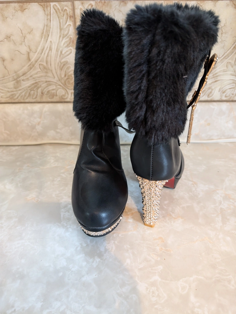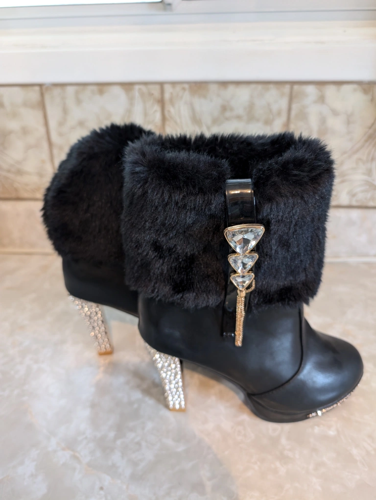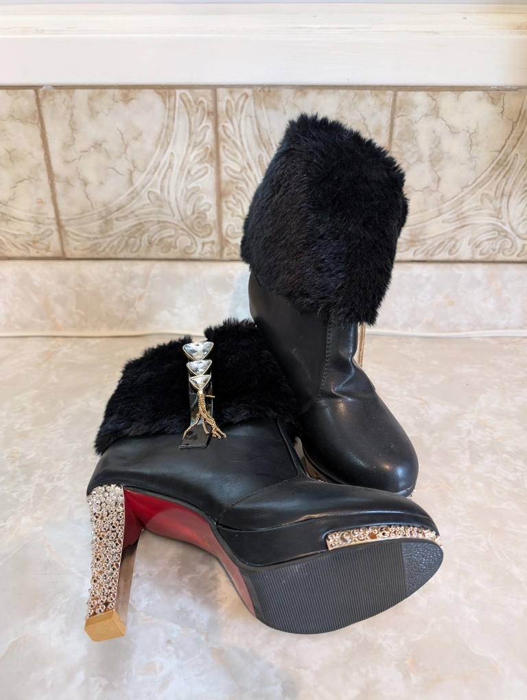 Women's black ankle boots. Faux fur trim at the top. Rose Gold spike accents on the heel and sole. High heels. Size 8