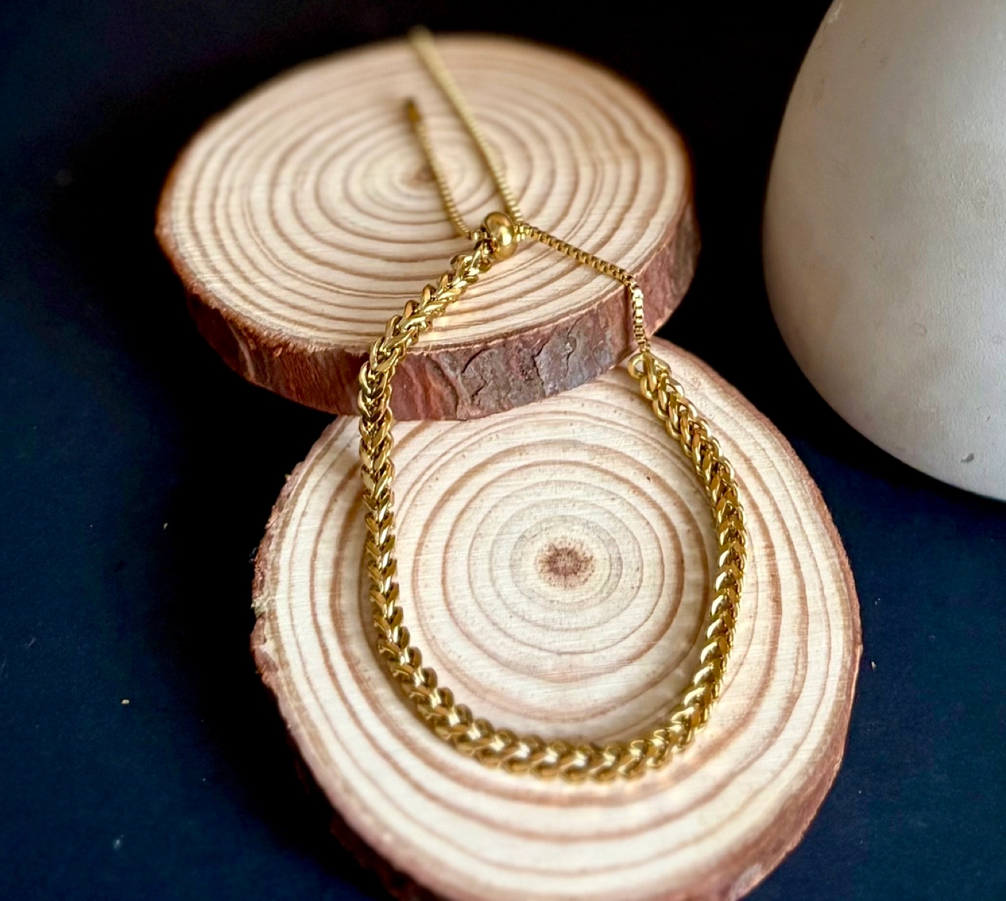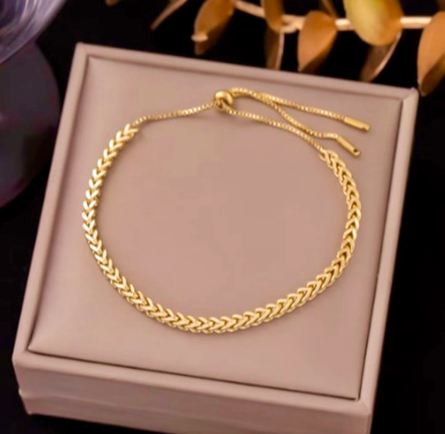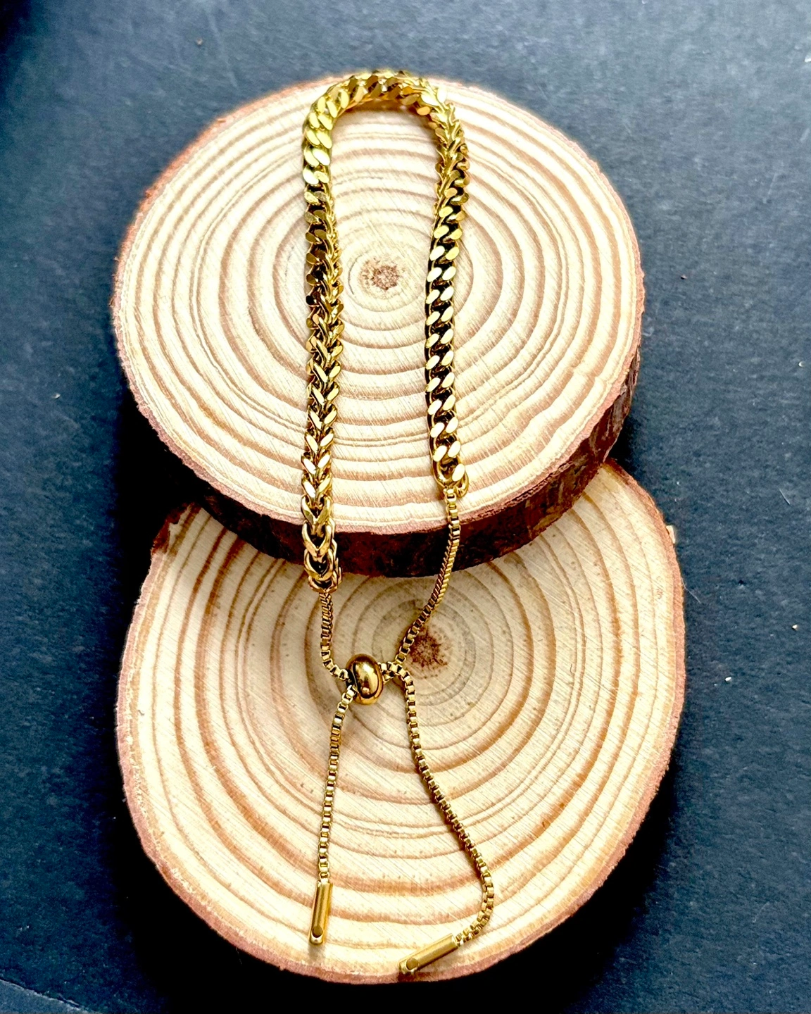 Beautiful gold-tone bracelet 18 k gold plated Stainless steel non tarnish Waterproof Features a chain design and adjustable drawstring closure. Looks great on its own or layered with other jewellery. Perfect for everyday wear Gift it or use yourself Cash only