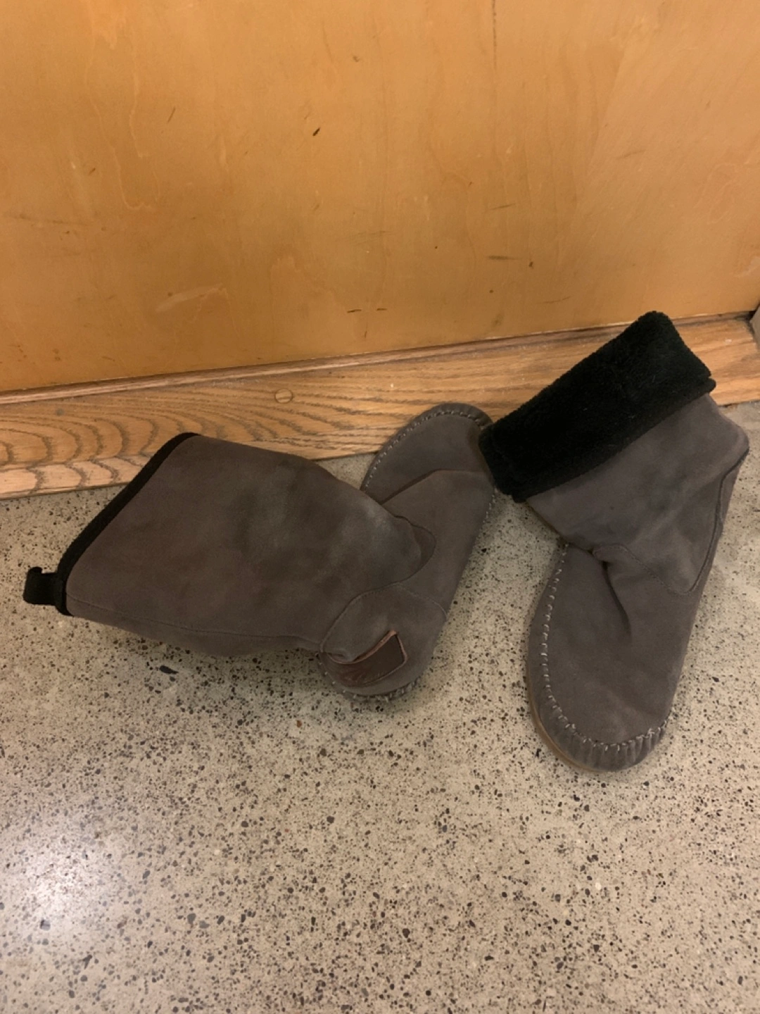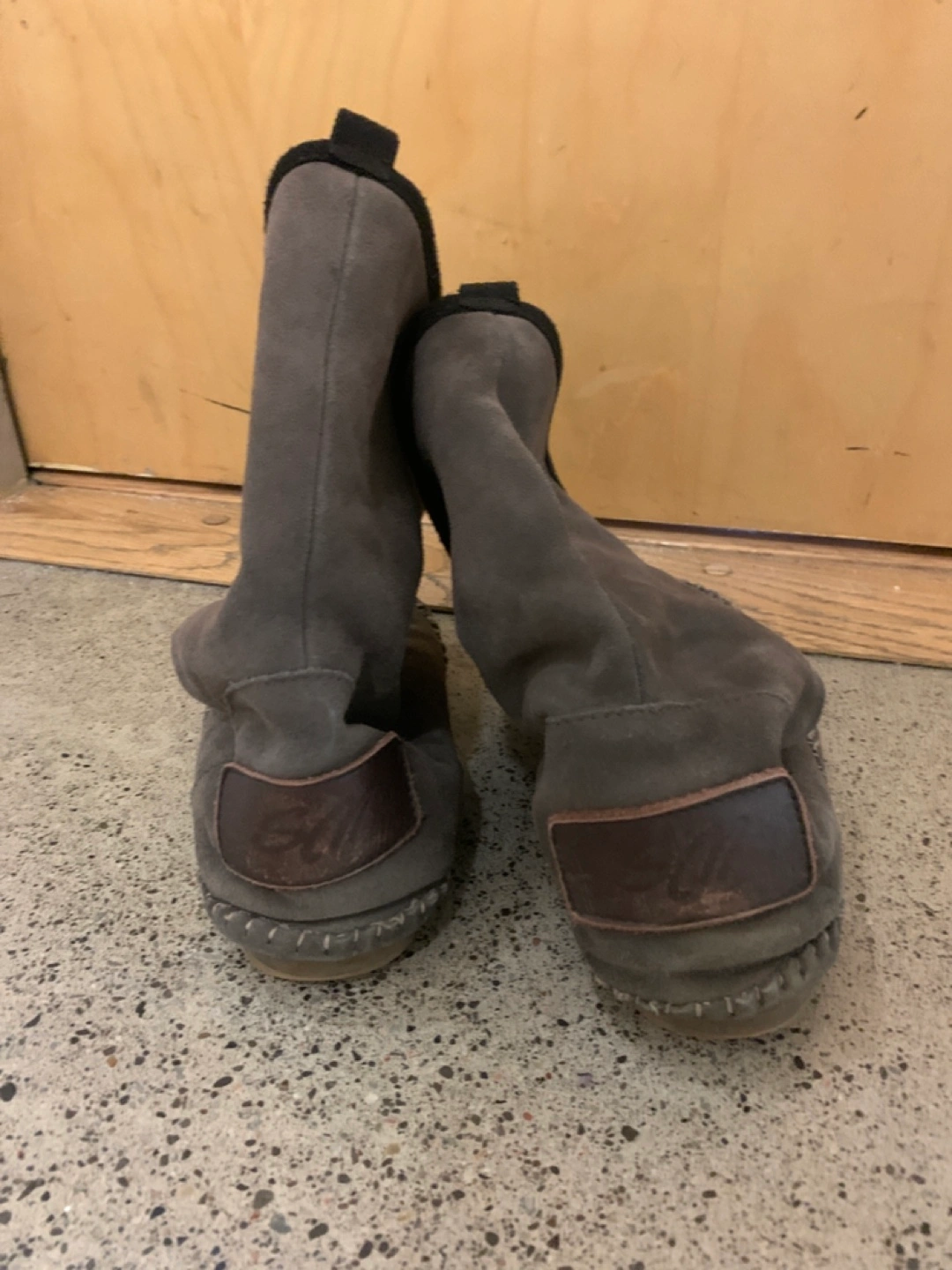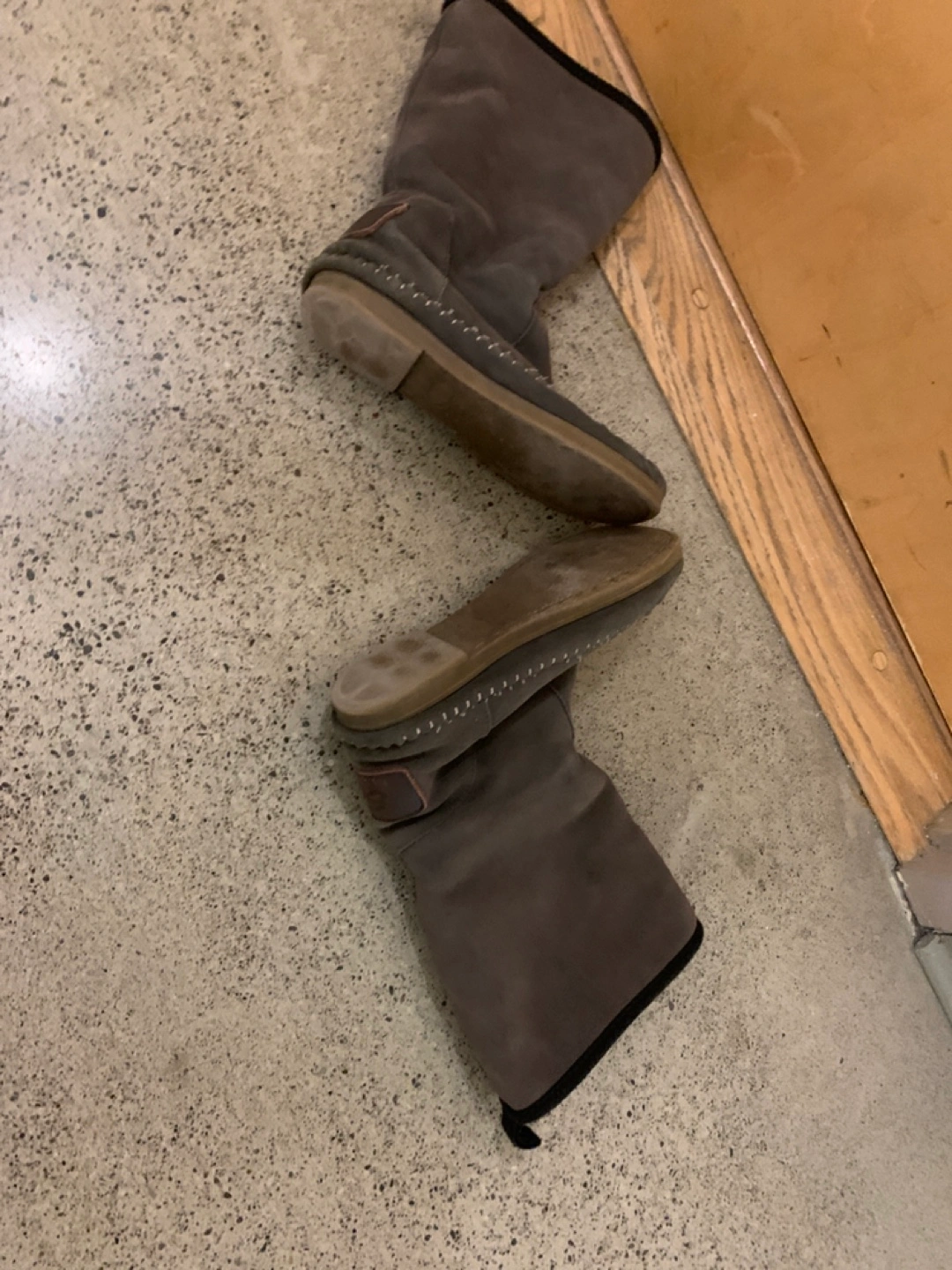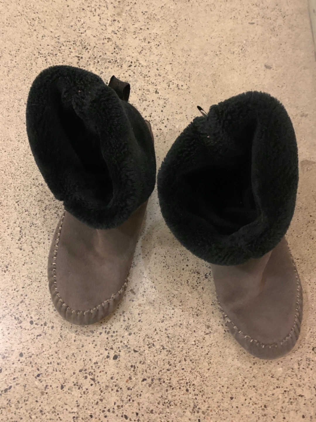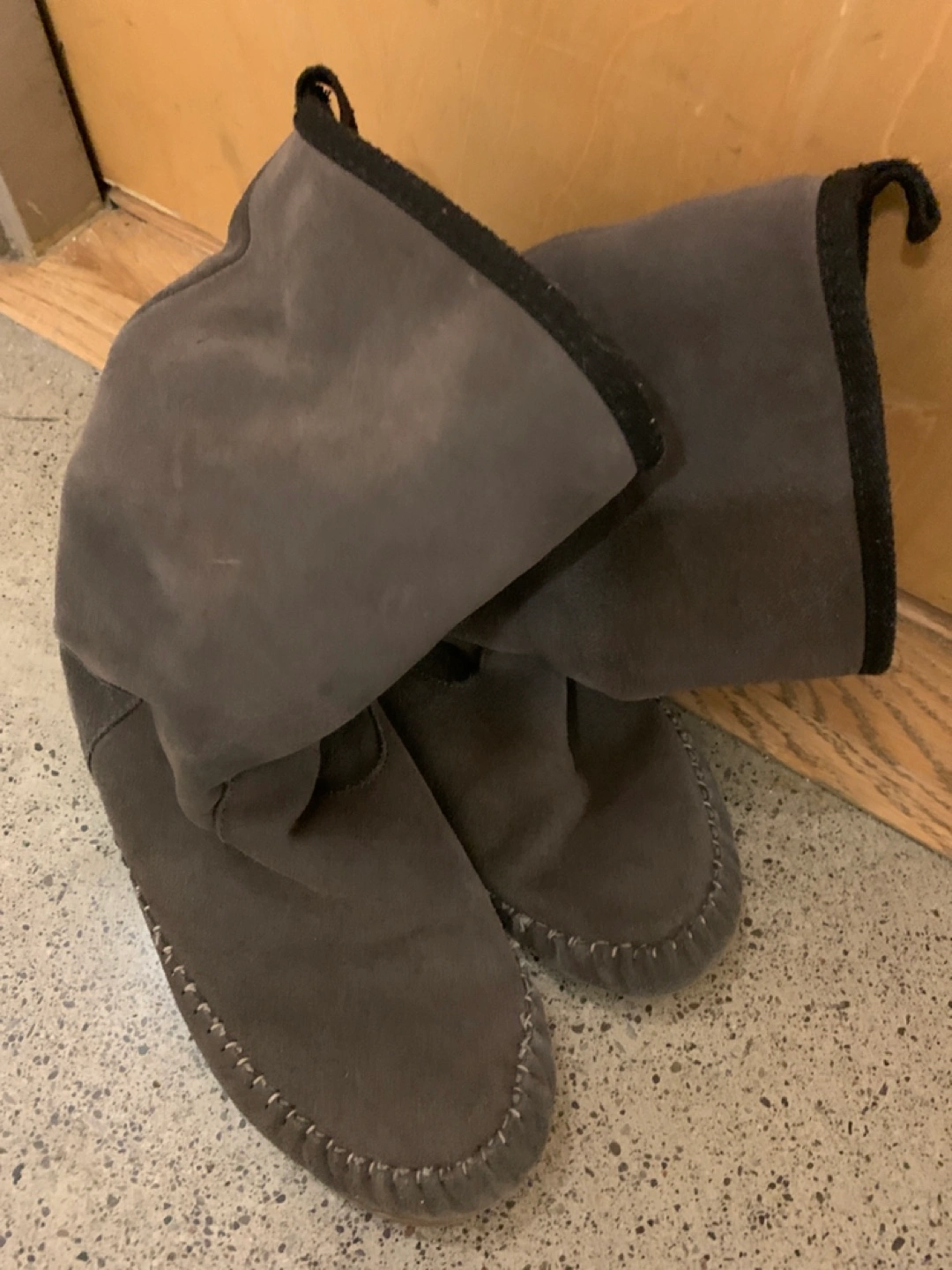 Pair of grey suede tall booties. Soft black fleece lining. Moccasin-style soles.