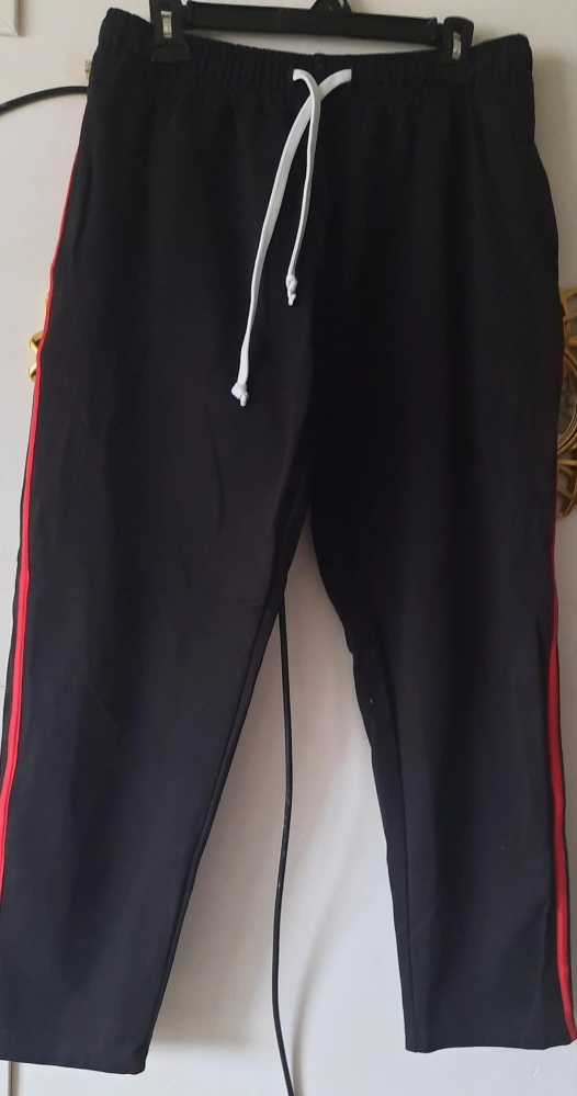 Black jogger pants. Features red side stripes and drawstring waist. Inseam 28", 2 side pockets and a back pocket Good condition.