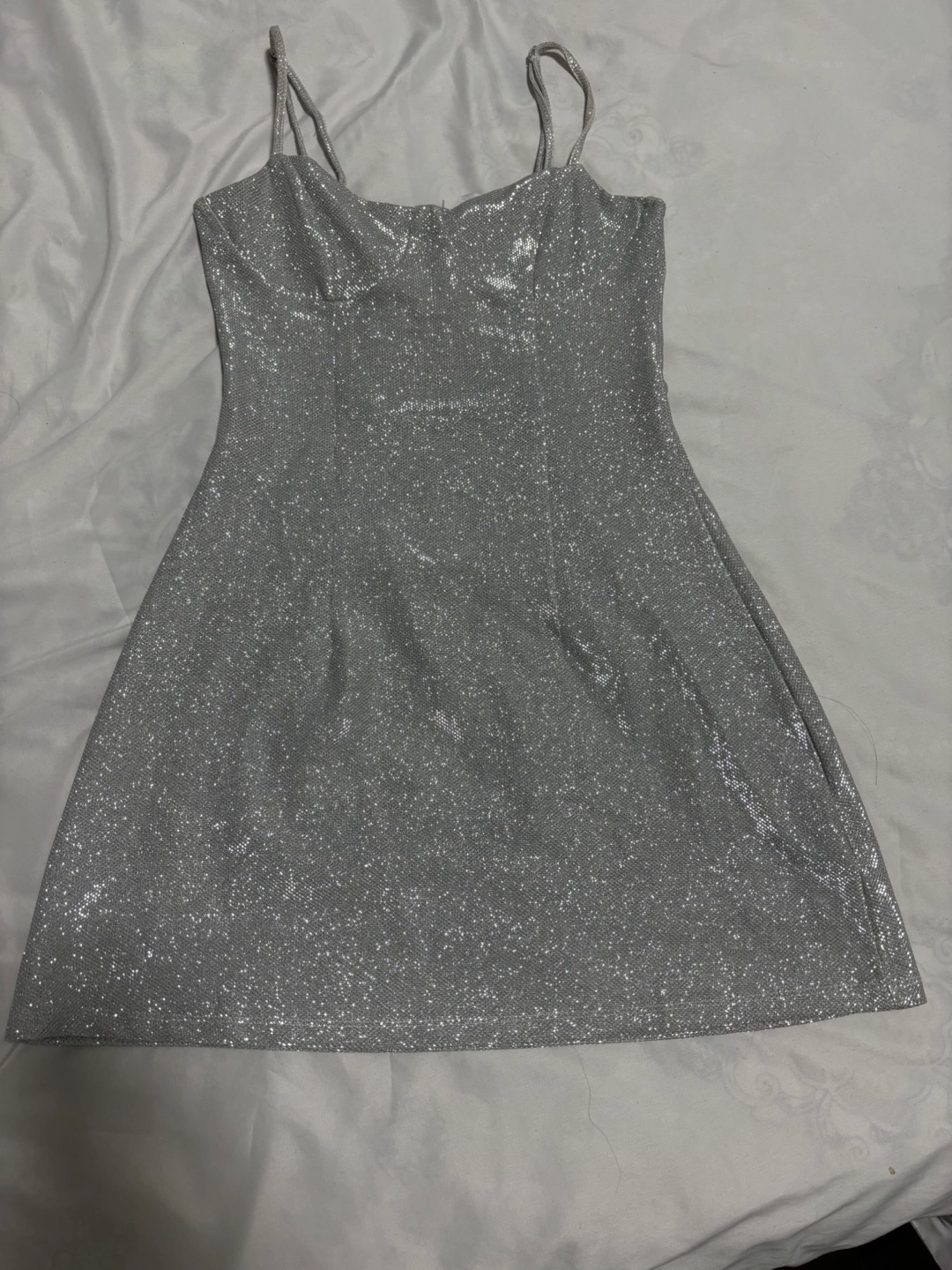 Beautiful silver sparkly mini dress. Spaghetti straps. Great for a party or special occasion.