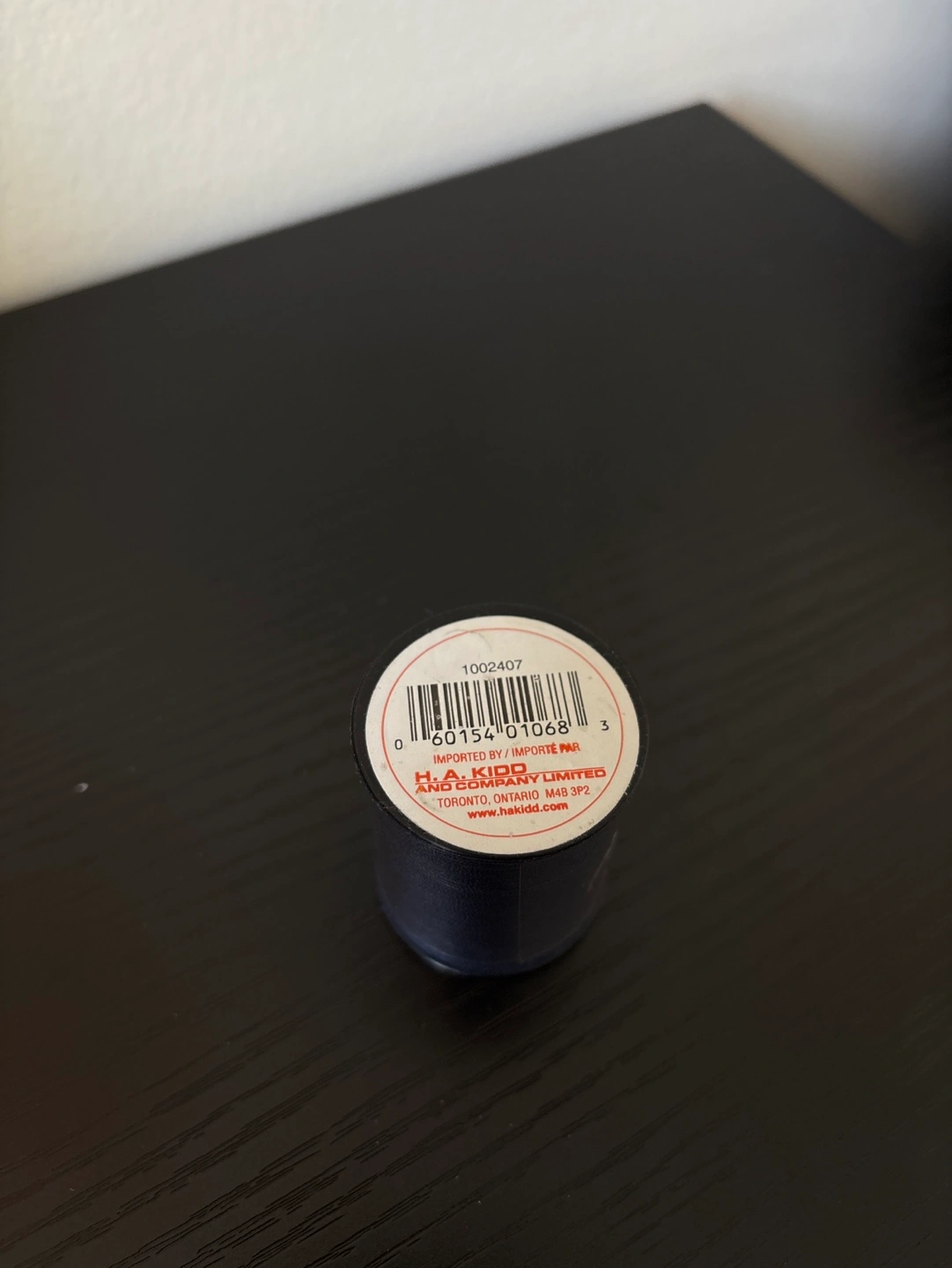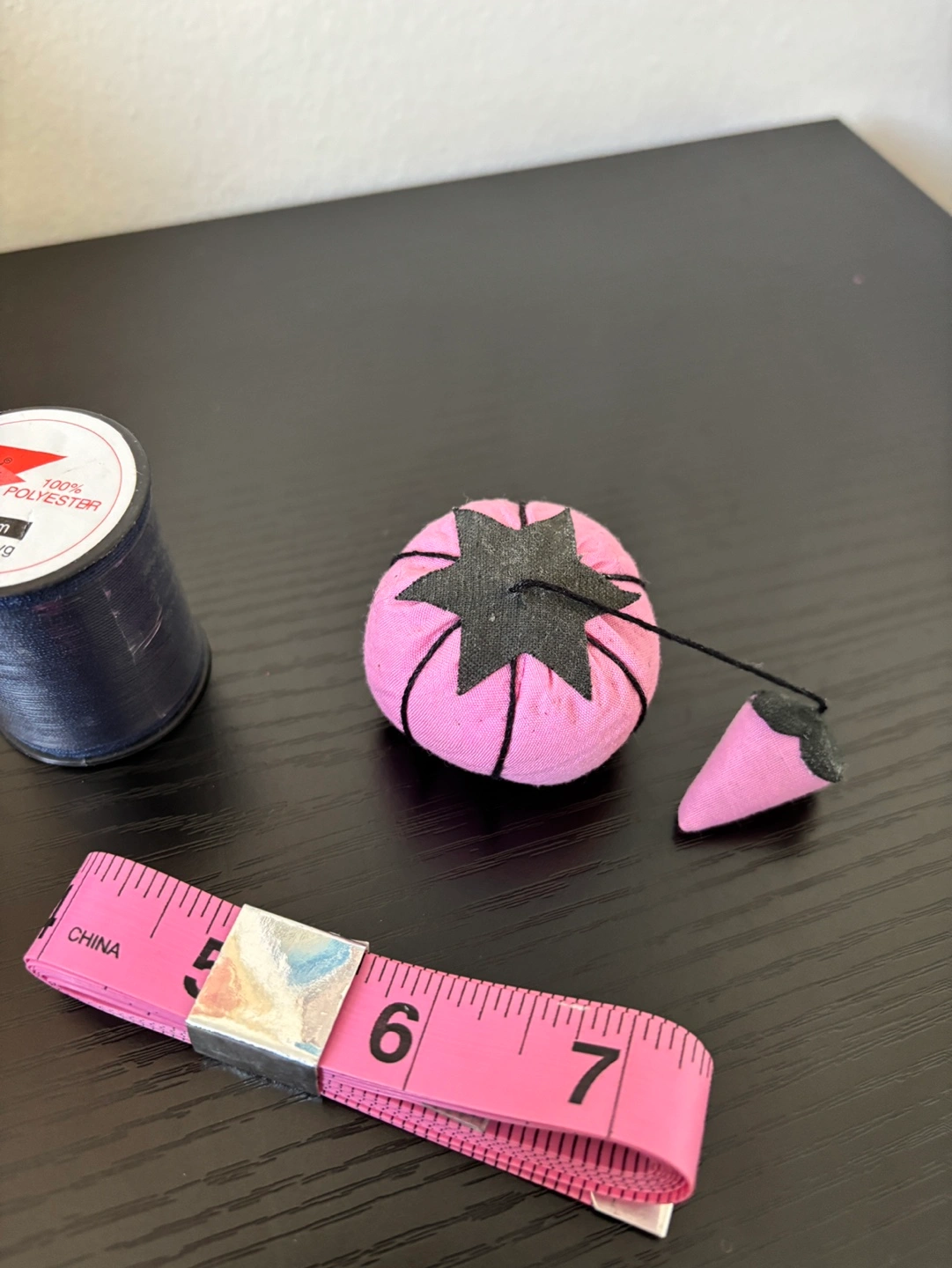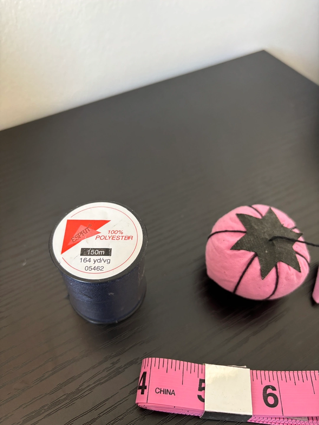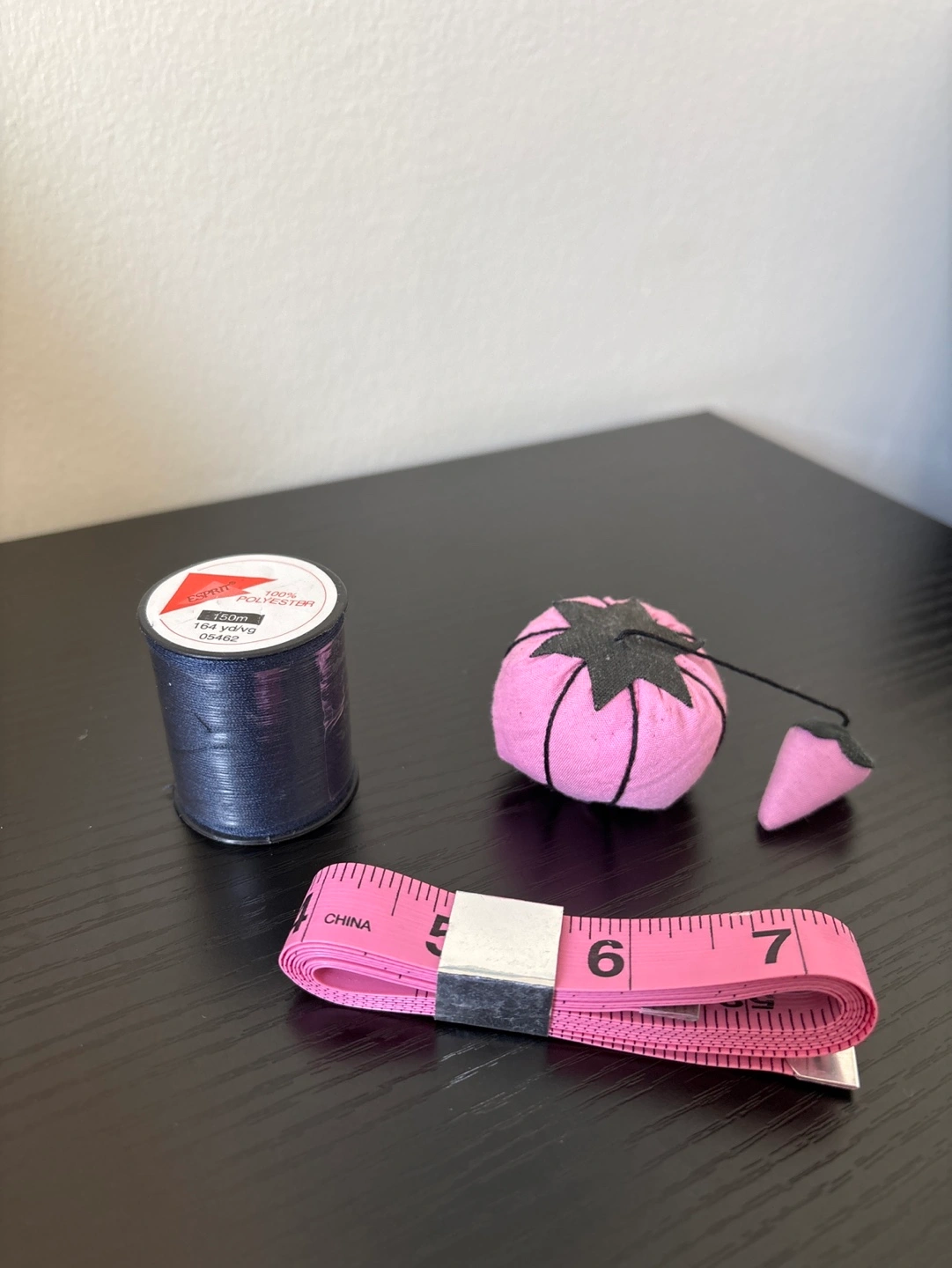 Pink pincushion with black star, navy thread spool (Esprit brand, 100% polyester, 150m), pink tape measure (in & cm). Great for sewing projects. Cash only. Pick up at RBC Bathurst and Sheppard.