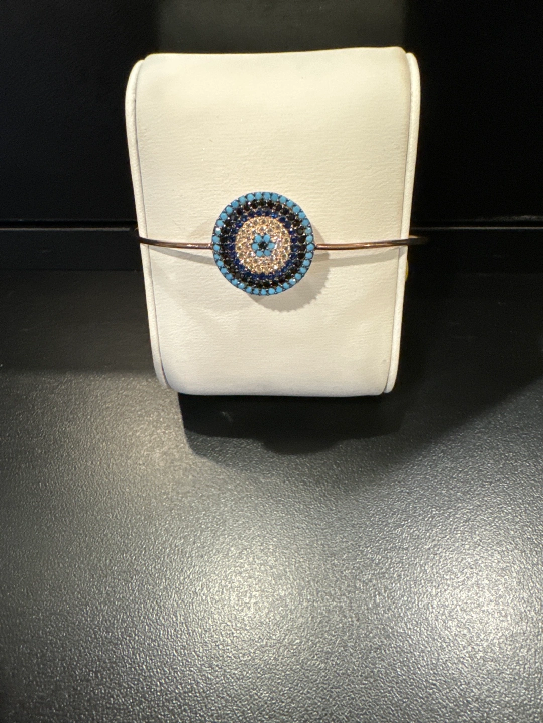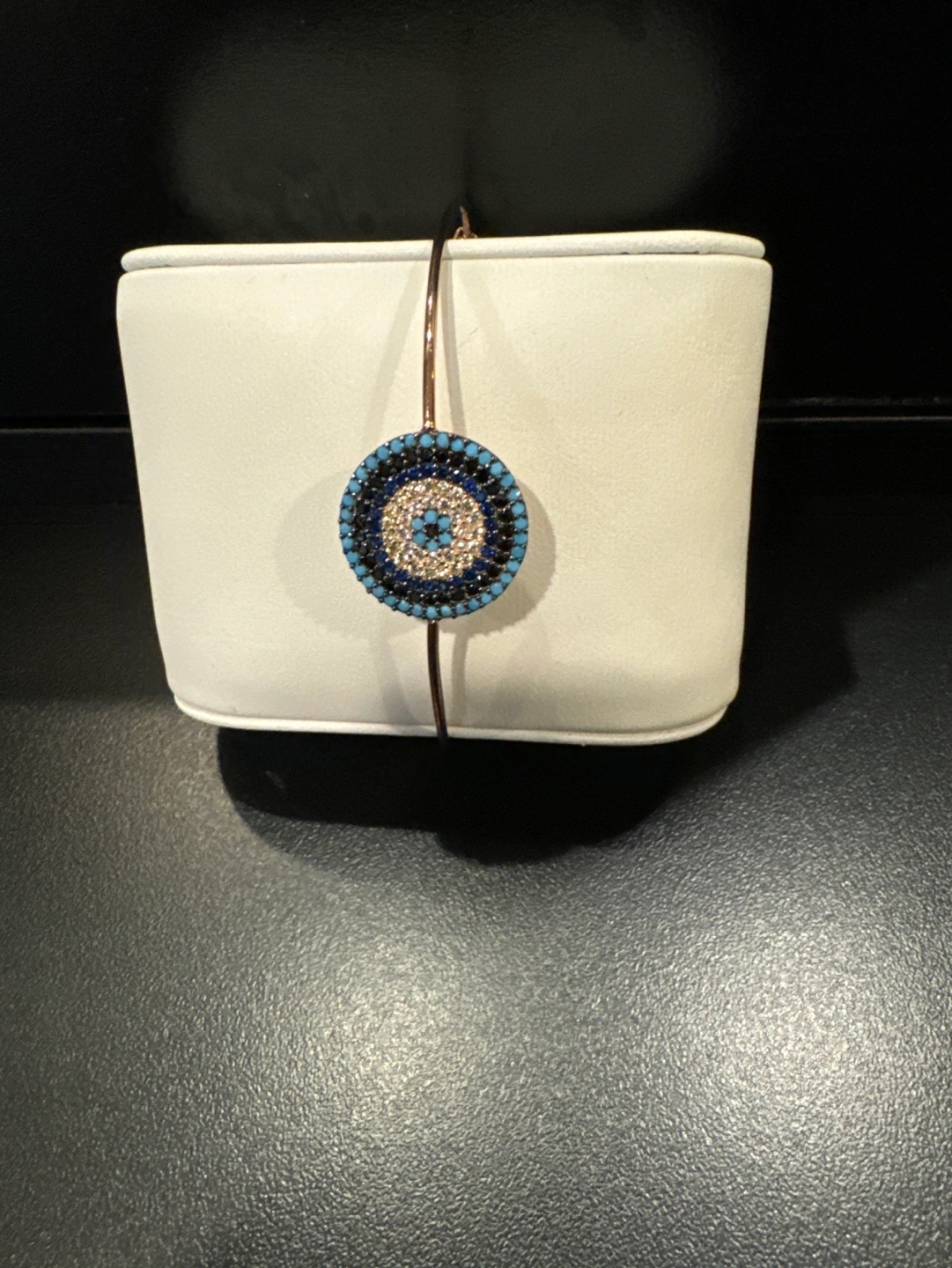 Beautiful rose gold bangle bracelet. Features a round evil eye charm encrusted with tiny blue, black and clear stones. Elegant and eye-catching piece. Real sterling silver . Rose gold plated