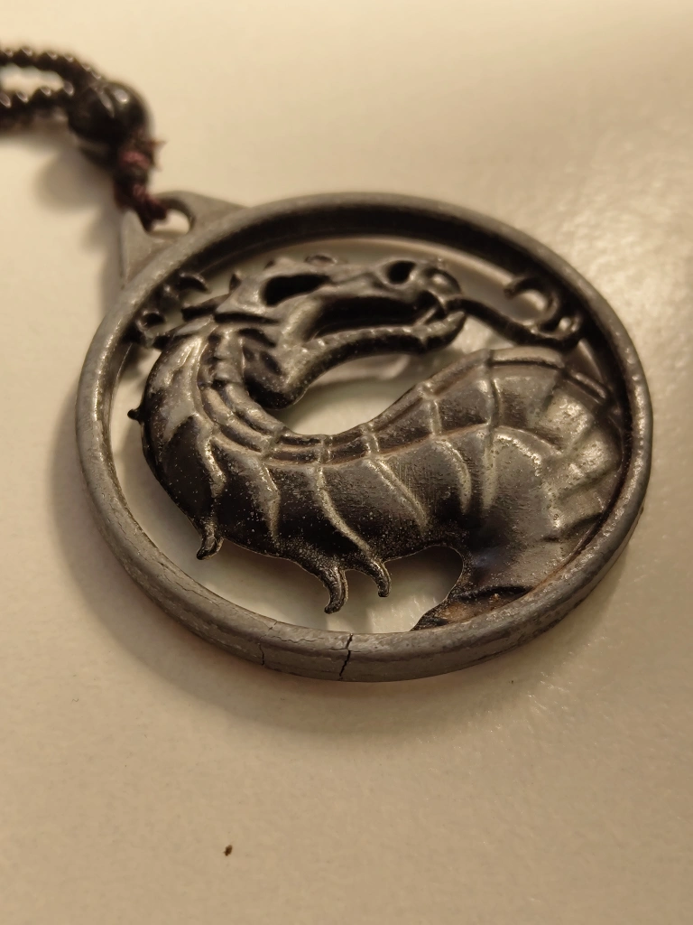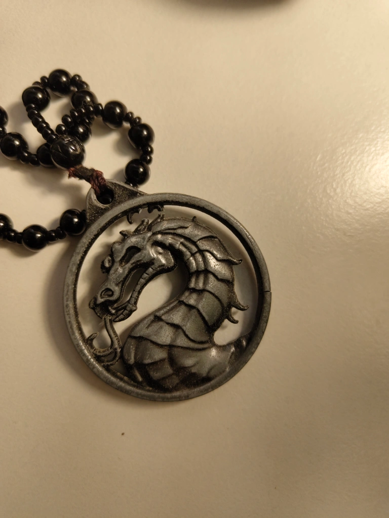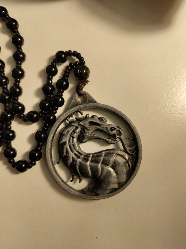 Black beaded necklace. Features a circular pendant with a dragon design. Metal pendant, possibly pewter. Shows some minor wearand a small crack pickup and cash only