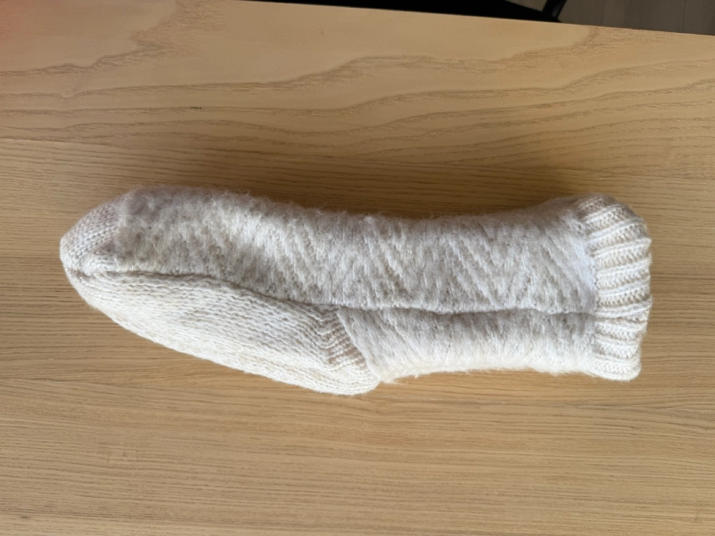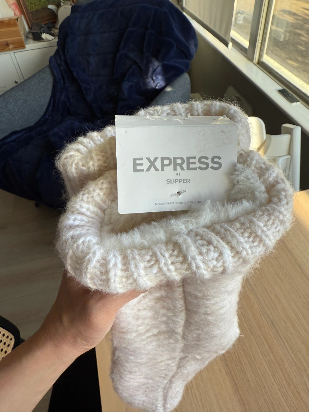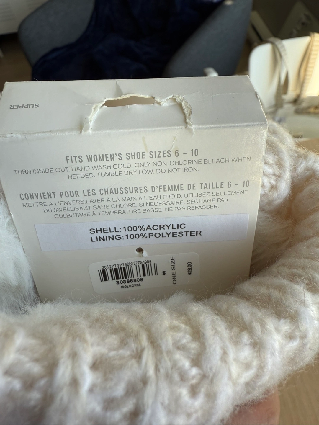 Brand new condition with tags Cream-coloured knitted slipper socks. Cozy and warm. Fits women's shoe sizes 6-10. Acrylic shell and polyester lining. Machine washable. Got for $28 usd