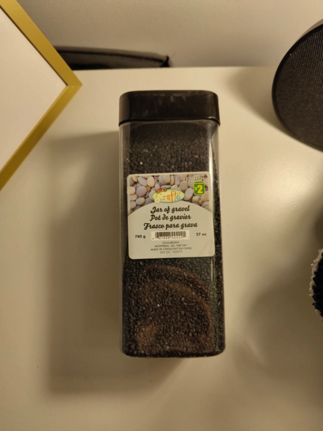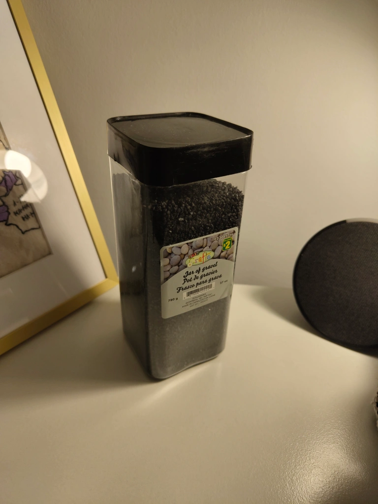 Black gravel in a clear plastic jar. Perfect for crafts, vase or aquariums. Unopened. 50%off retail price pickup and cash only
