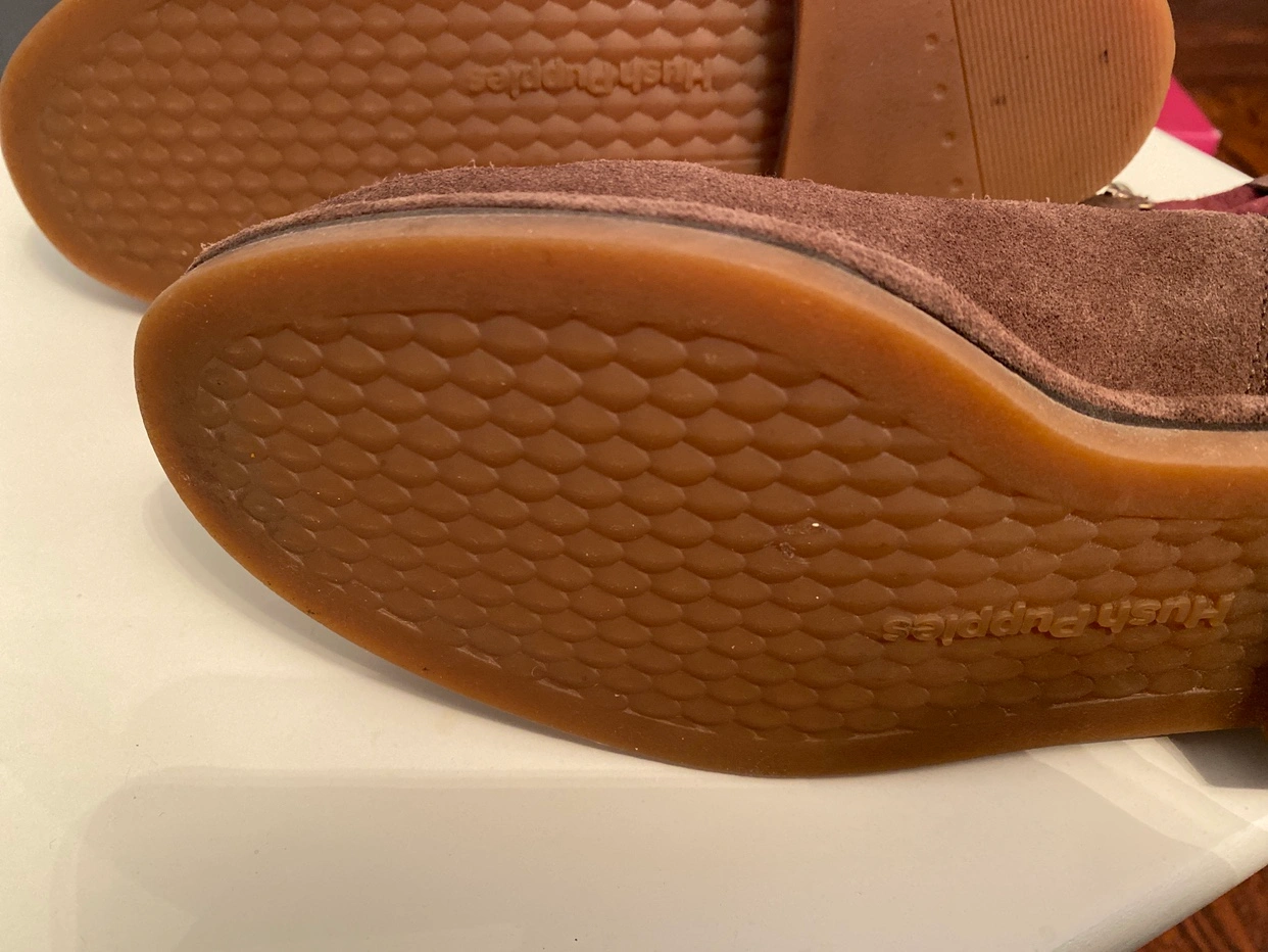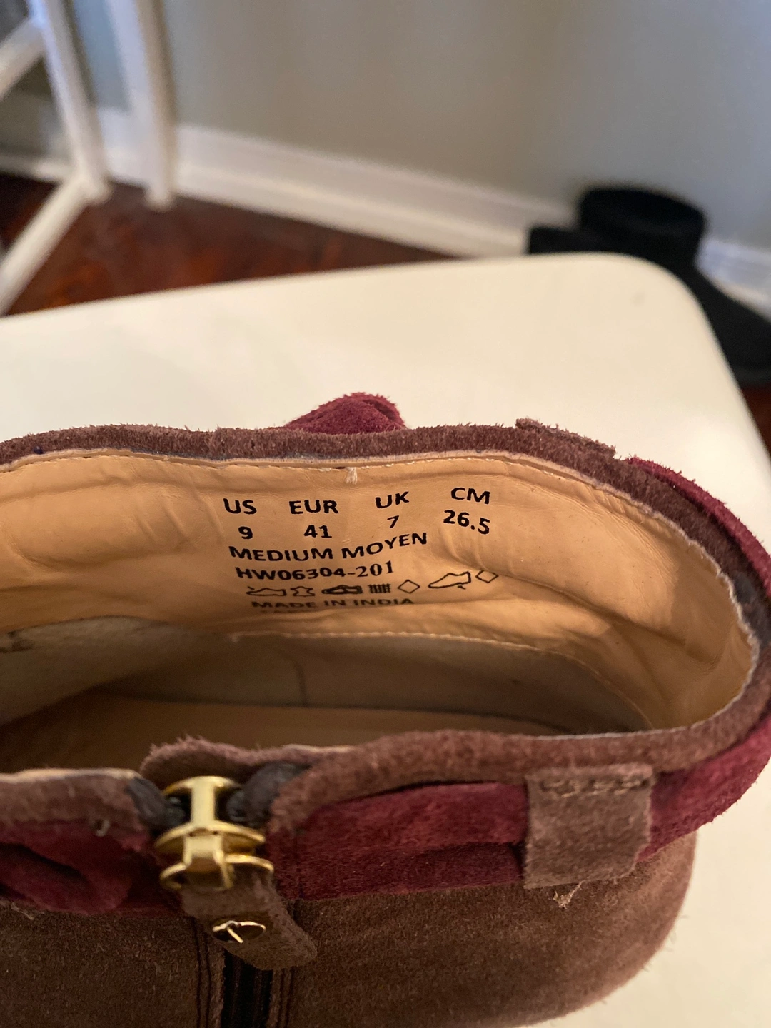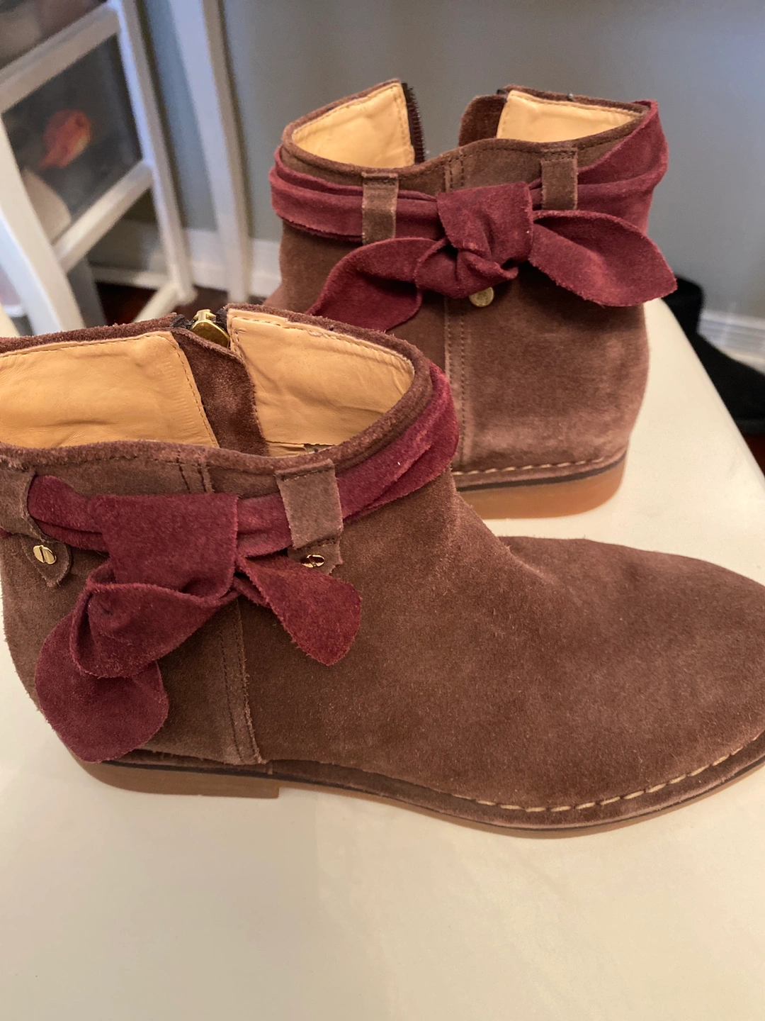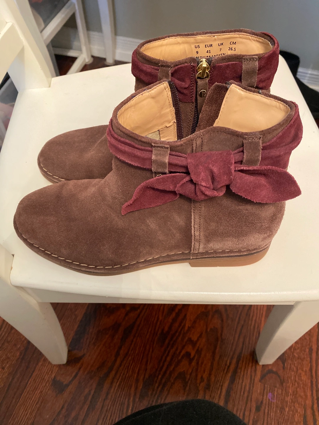 Size 9 brown suede boots, are zip up And have a pretty maroon now. Never worn outside as you can see on the soles.