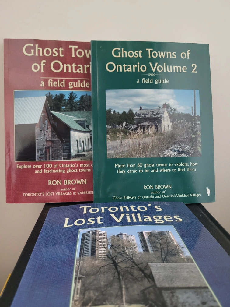 Set of three books by Ron Brown. Ghost Towns of Ontario, Ghost Towns of Ontario Volume 2, and Toronto's Lost Villages. Field guides featuring photos and information on Ontario's abandoned towns and villages.