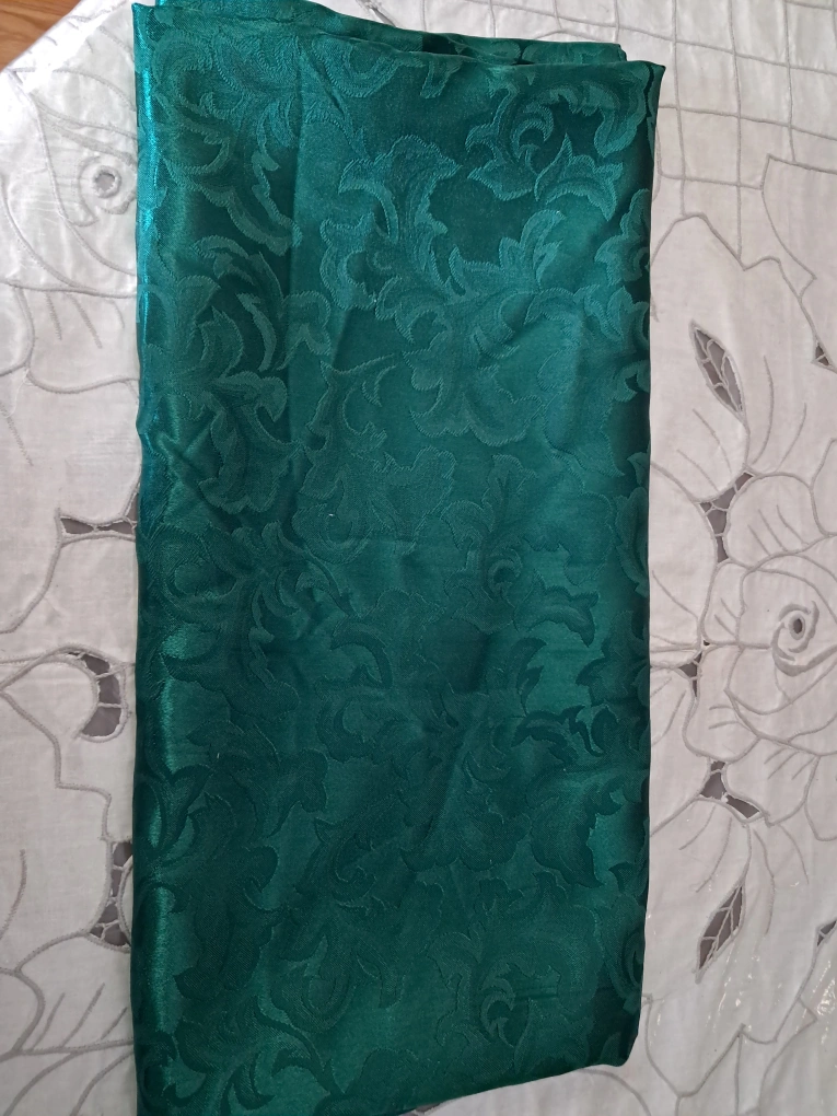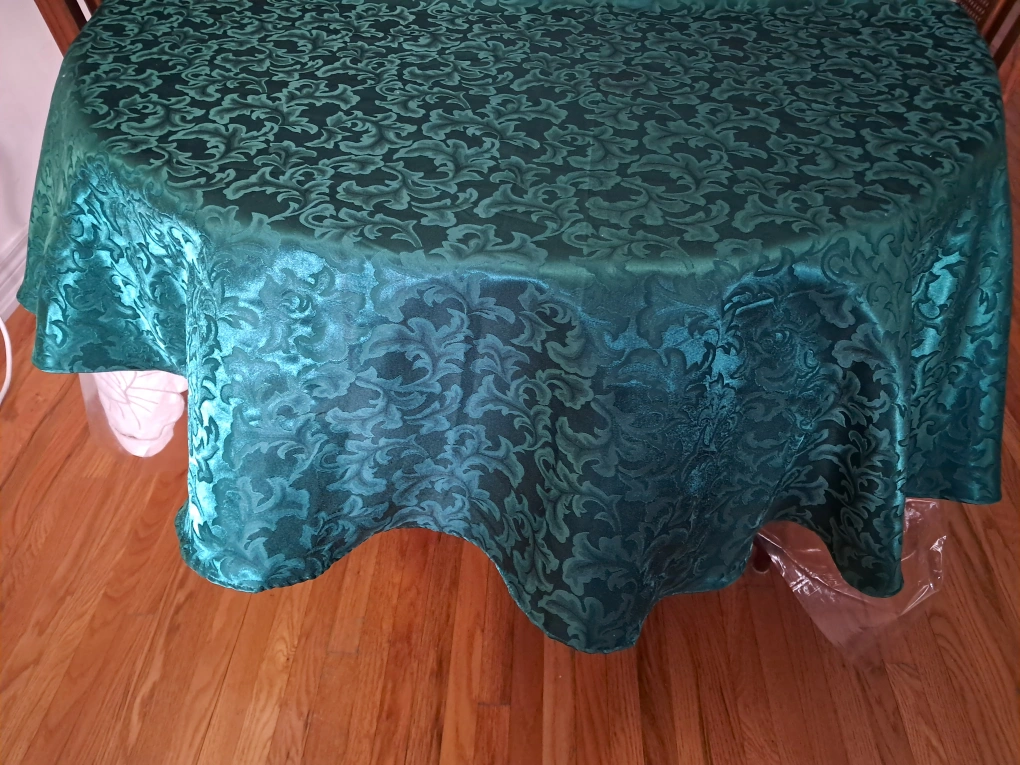 Beautiful teal damask tablecloth. Round shape. Elegant design. Perfect for formal occasions or everyday use. Looks luxurious.