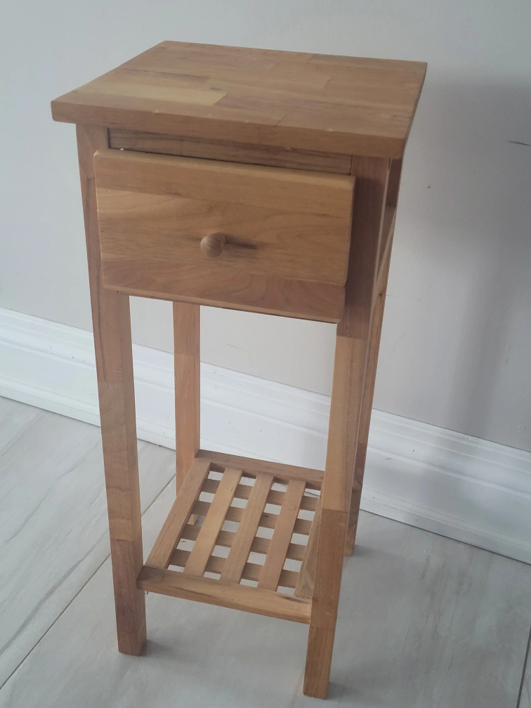 Small solid wood end table/side table/plant stand. Features one working drawer and a lower shelf. Light brown wood. Can be stained or pained. can also be used as a plant stand. Perfect for a small space.