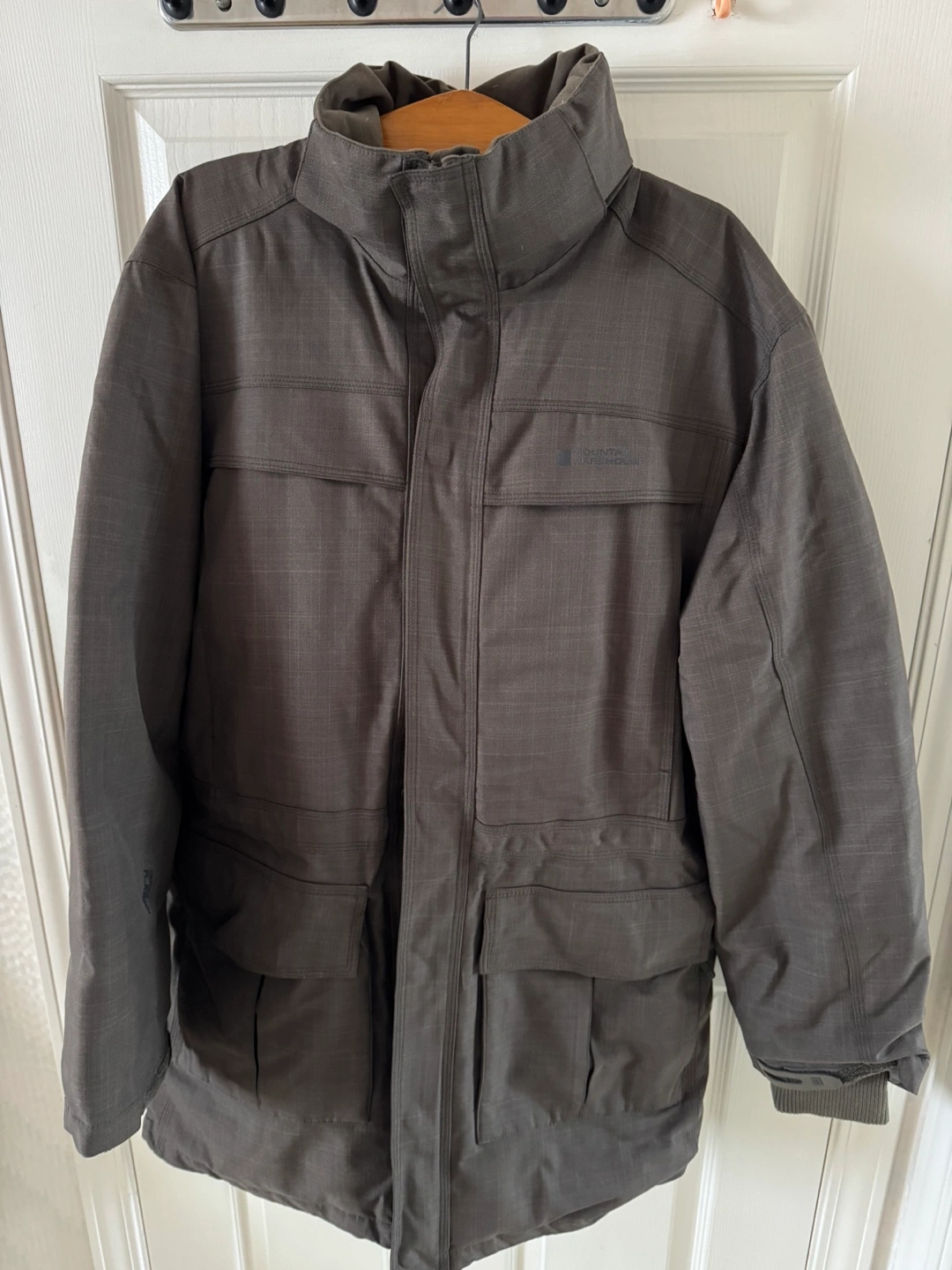 Warm winter parka. Dark olive green. Features a faux fur-trimmed hood (removable) multiple pockets, and a durable outer shell. 75% down, 25% feathers. Great for cold weather.