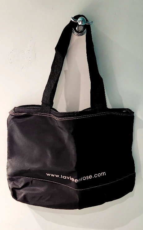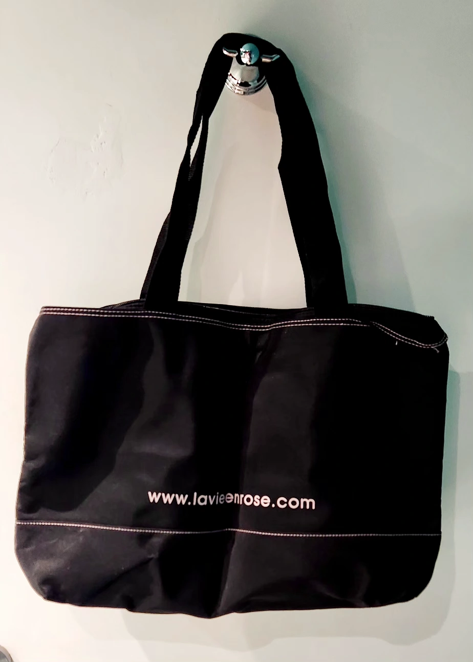La Vie En Rose black tote bag with two handles. Features a zipper closure and accented with pink writing and stitching. Measures 18" long x 12" tall x 4" wide. Never been used.