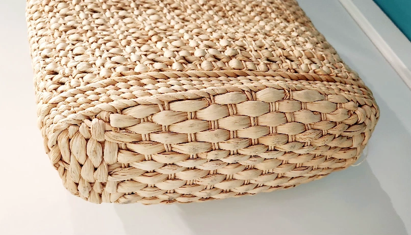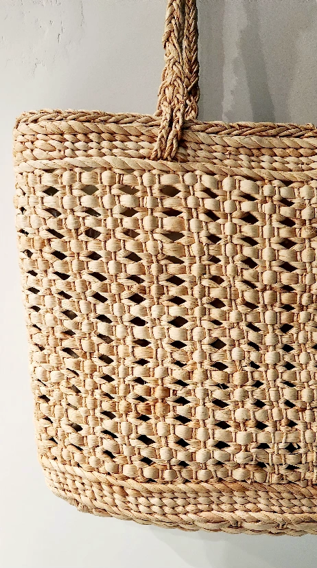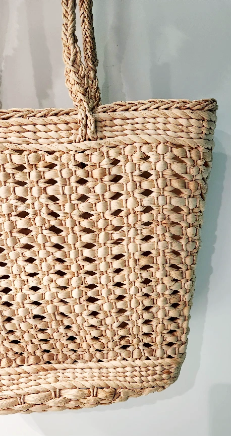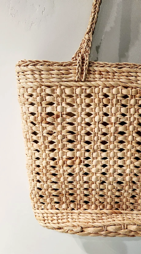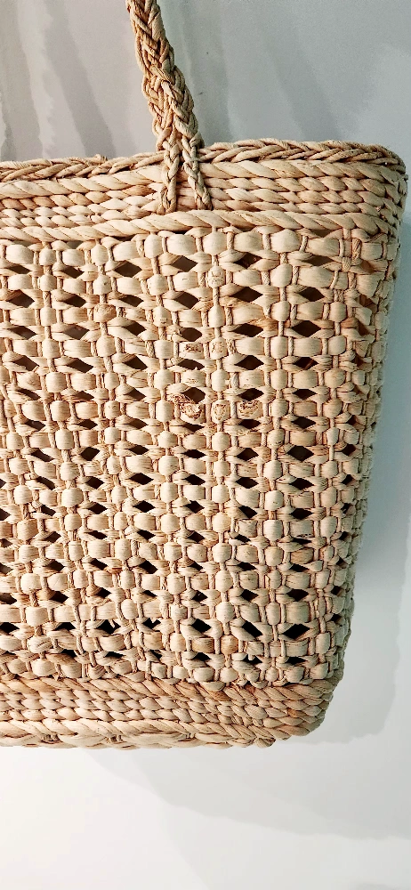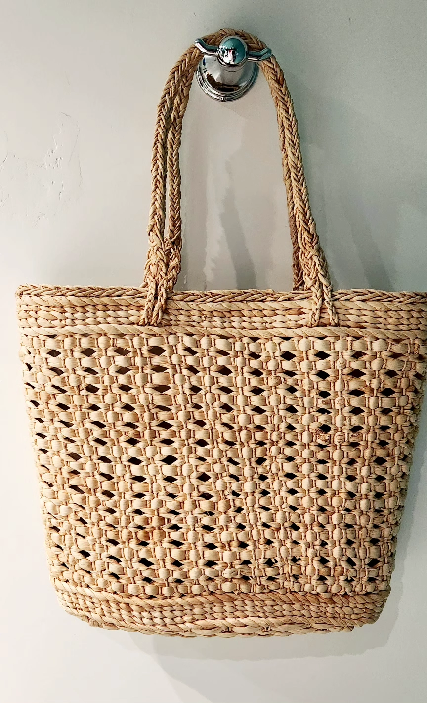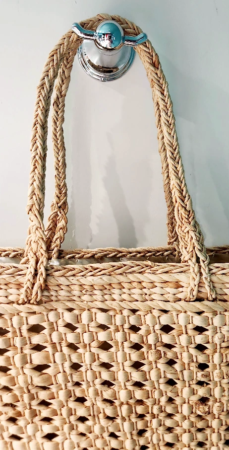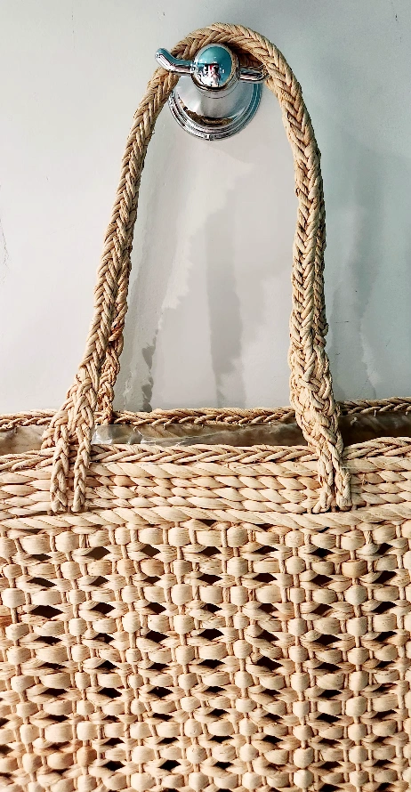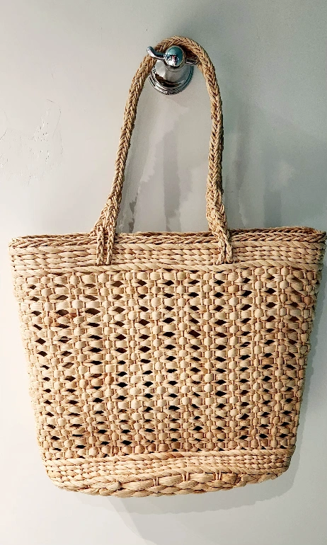 Large straw tote bag with plastic inside liner. Features braided rope handles and a unique woven pattern. Perfect for the beach this summer.
