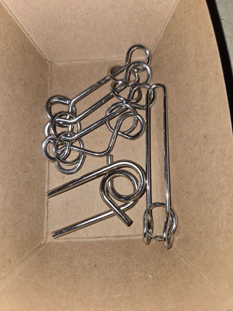 Set of interconnected metal puzzles. Challenging brain teaser. Great for improving problem-solving skills.