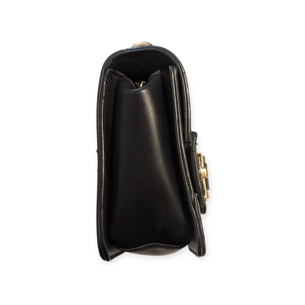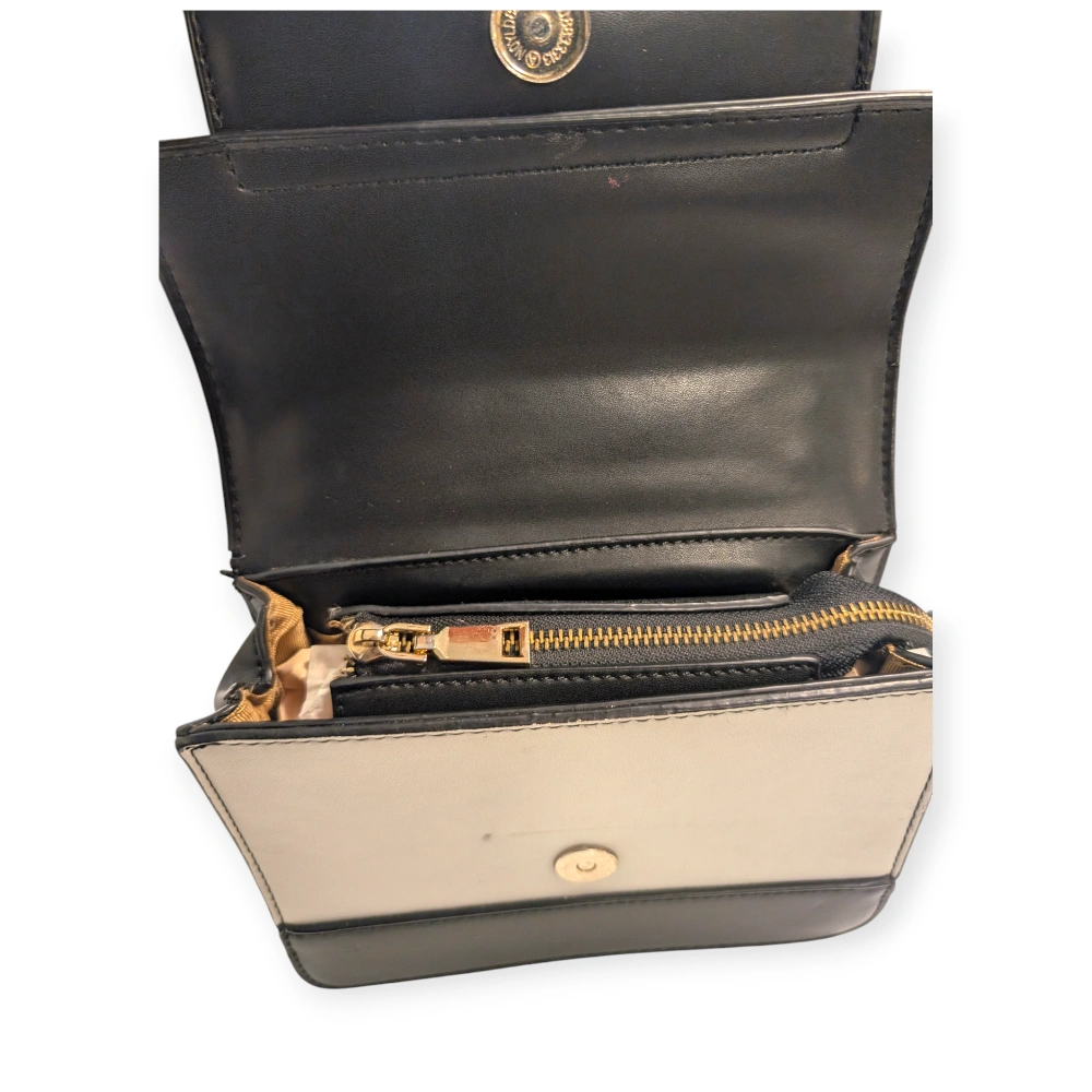 Stylish crossbody bag. Features black and off-white leather. Gold-toned hardware accents. Multiple compartments. Detachable strap. Small and compact.