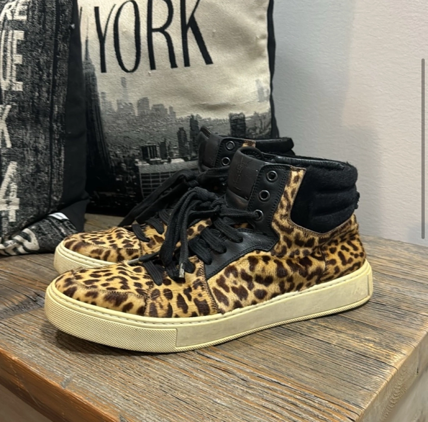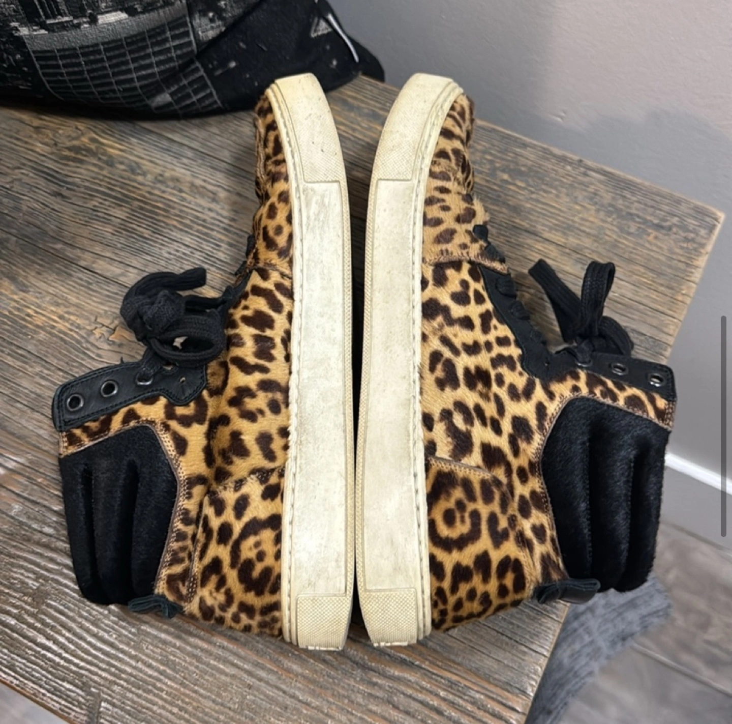 YSL pony hair leopard print high top sneakers - 42.5 (9..5 womens /7-7.5 mens) These have been worn and are slouchy, discoloured to soles off white not white white now. Pretty good condition, slouchy doesn’t show when wearing. Laces could be replaced. No box or dust bag. First photo stock. Sole measures - 12” Please review wear carefully