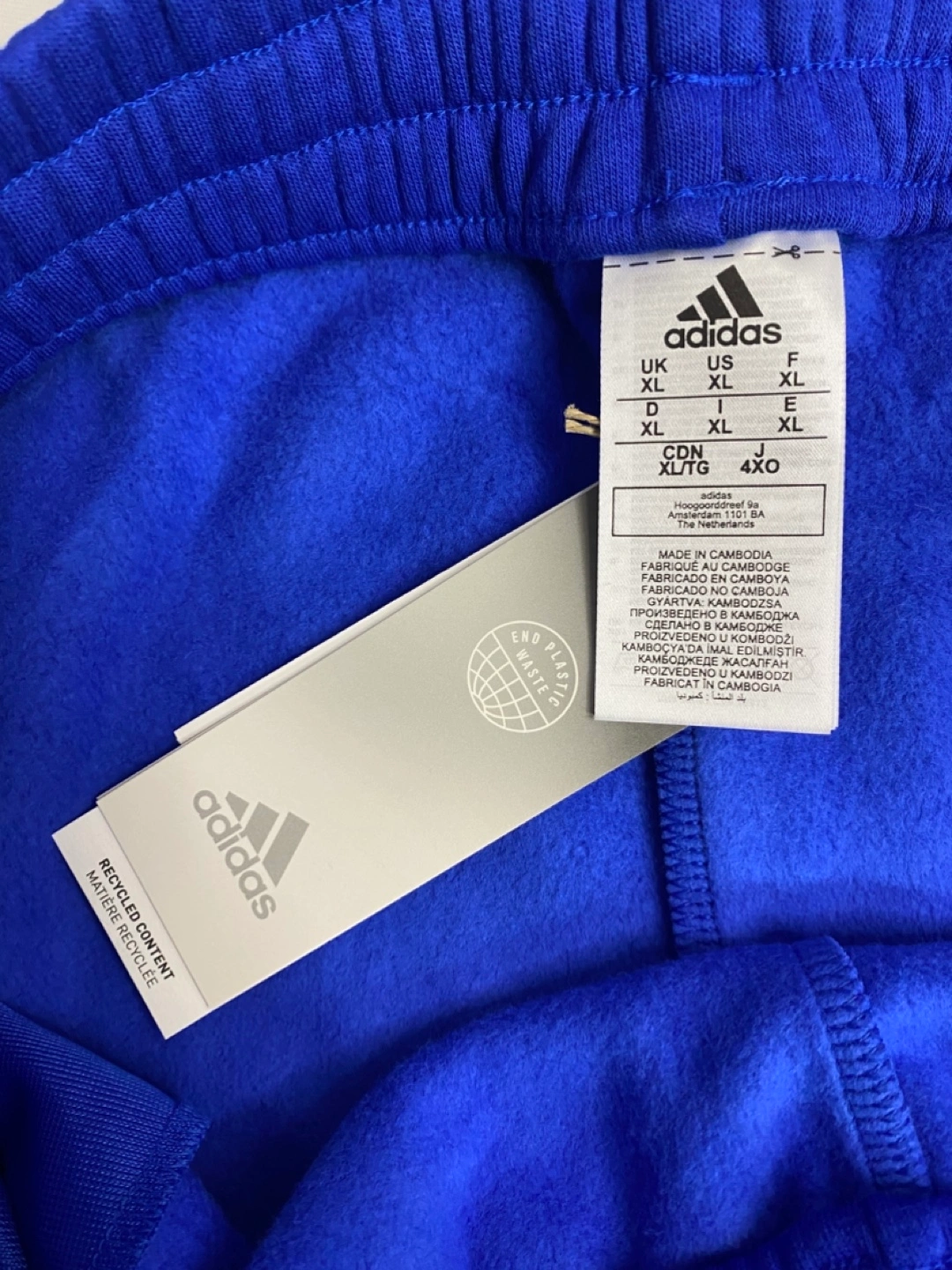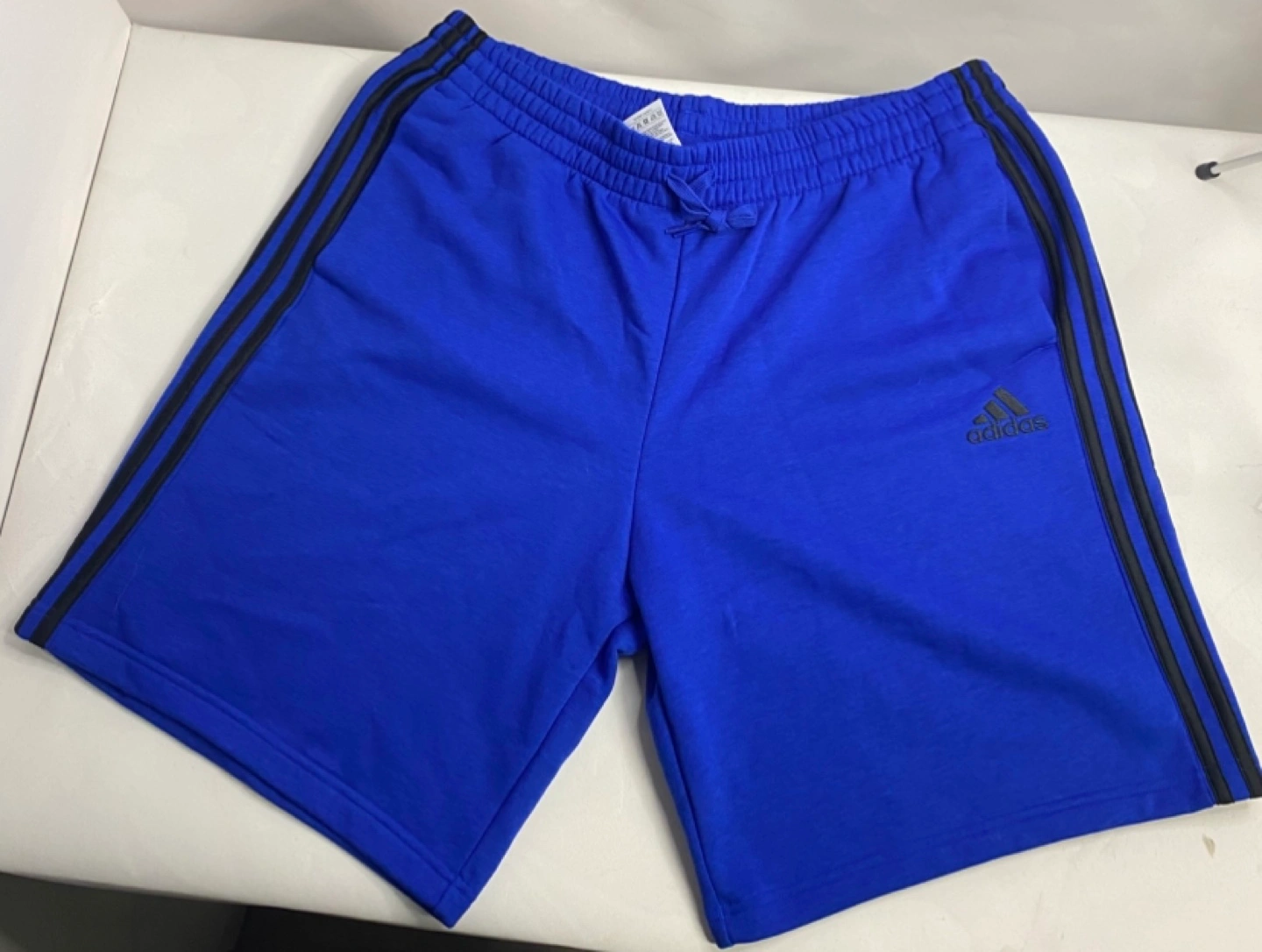 Men's Adidas shorts. Size XL. Blue colour. Features three black stripes on each side and Adidas logo. Made with recycled materials. Drawstring waist.