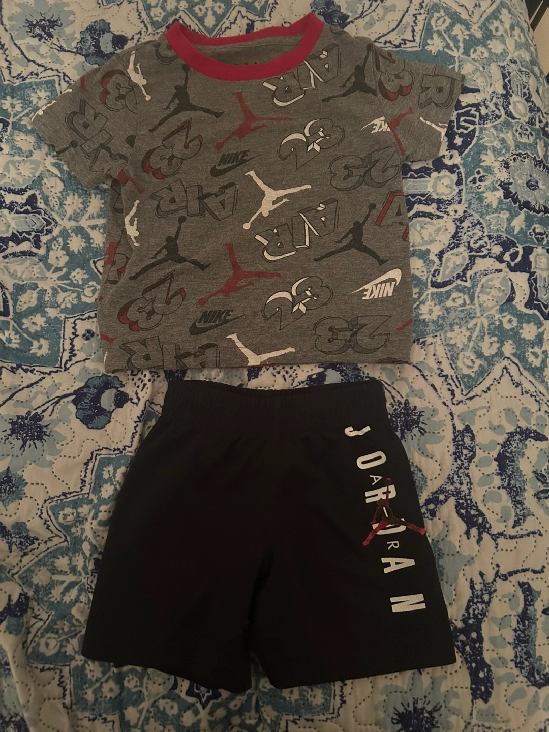 Adorable infant outfit. Grey short-sleeve shirt with various Jordan graphics. Black shorts with Jordan branding on the side. Perfect for your little one. Size 2T