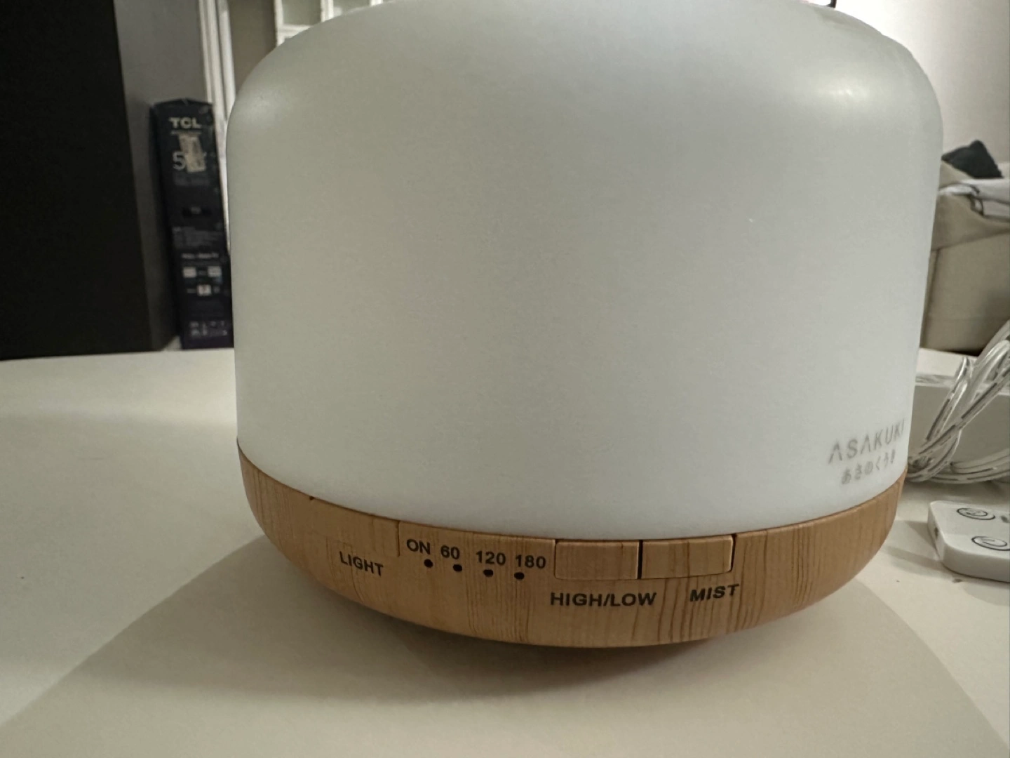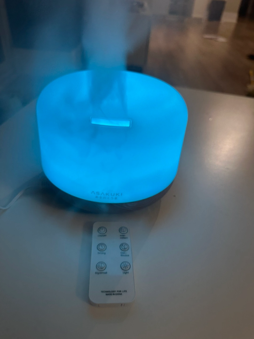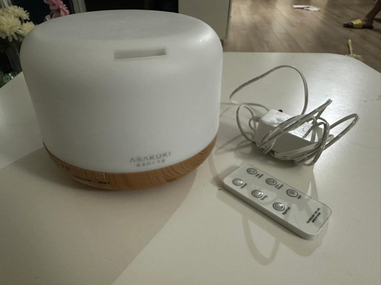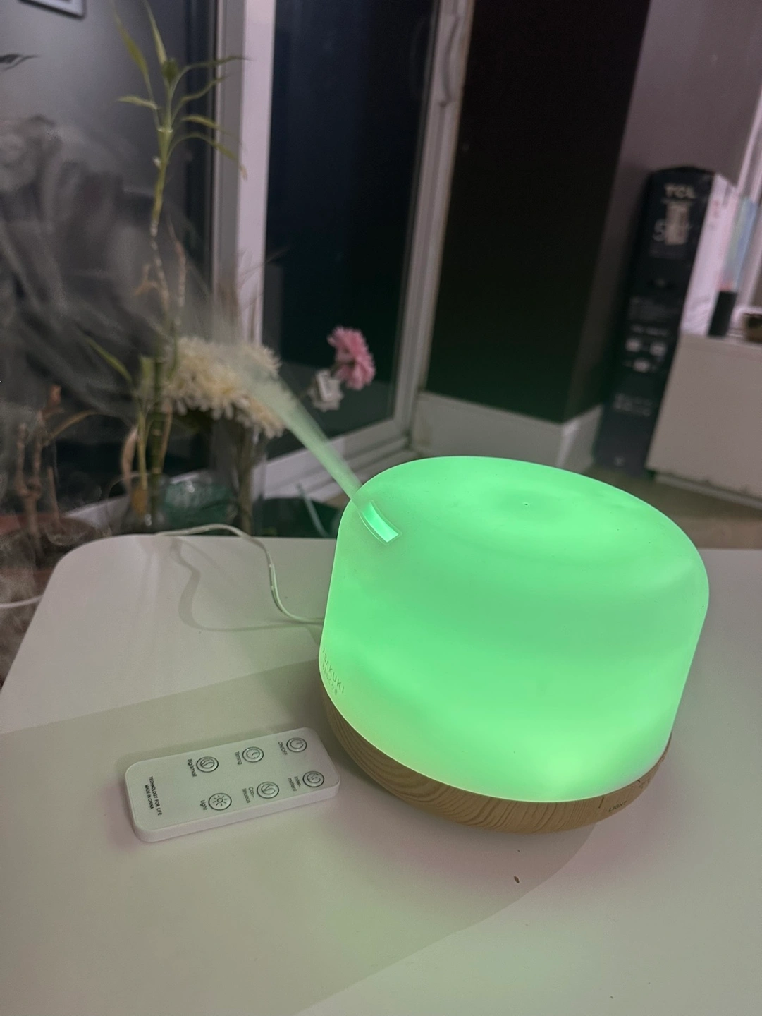 Ultrasonic aroma diffuser. Features colour changing LED light. Includes remote control. Multiple mist settings. Wooden base. Rarely used. Pickup only