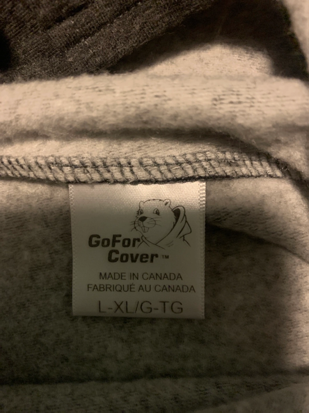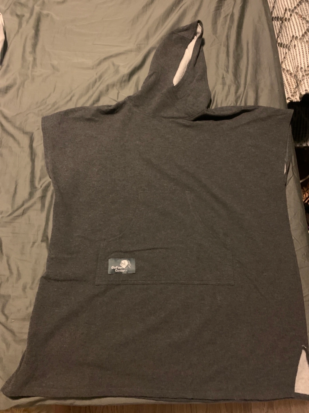 Grey hooded poncho towel. Large front pocket. Made in Canada. Size L/XL.