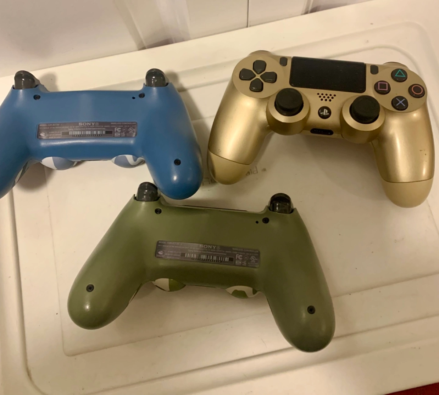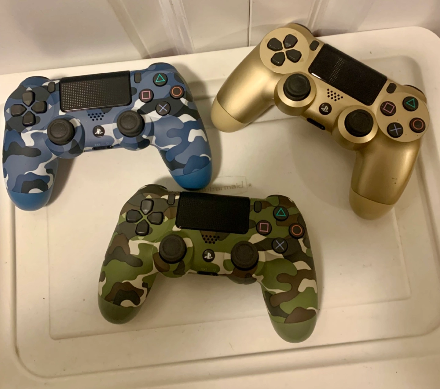 Three PS4 controllers. One gold, one blue camo, one green camo. Wireless controllers for Playstation 4. Pre-owned. Authentic 60$ EACH OR 150$ For All 3 !!